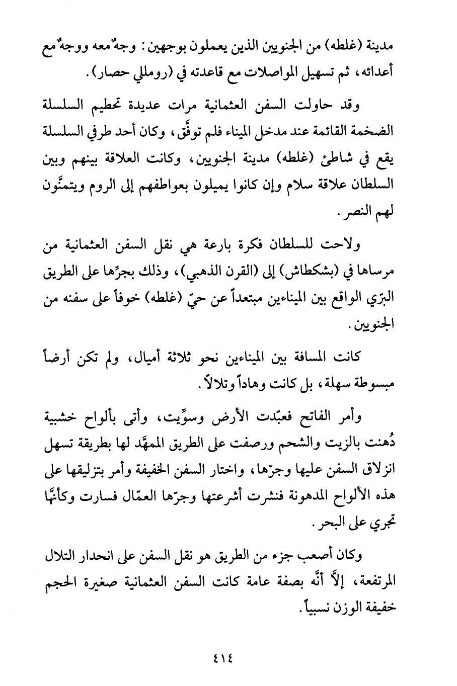 وأمر الفاتح فعبّدت الأرض وسوِّيت، وأتى بألواح خشبية دُهنت بالزيت والشحم ورصفت على الطريق الممهَّد لها بطريقة تسهل انزلاق السفن عليها وجرّها، واختار السفن الخفيفة وأمر بتزليقها على هذه الألواح المدهونة فنشرت أشرعتها وجرّها العمّال فسارت وكأنَّها تجري على البحر.
