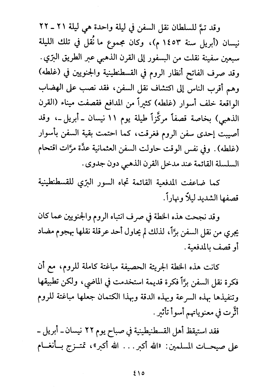 وقد تمَّ للسلطان نقل السفن في ليلة واحدة هي ليلة 21 - 22 نيسان (أبريل سنة 1453 م)، وكان مجموع ما نُقل في تلك الليلة سبعين سفينة نقلت من البسفور إلى القرن الذهبي عبر الطريق البرّي.