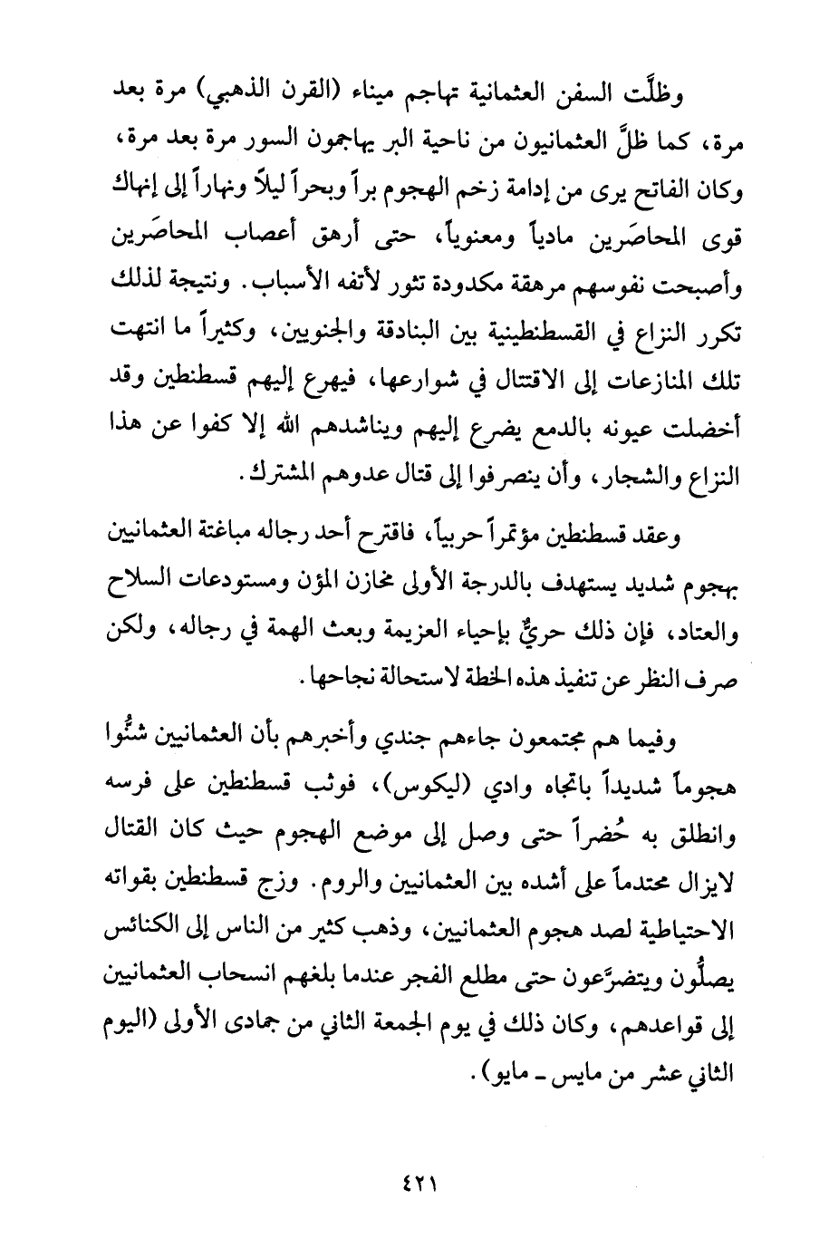 وفيما هم مجتمعون جاءهم جندي وأخبرهم بأن العثمانيين شنُّوا هجوماً شديداً باتجاه وادي (ليكوس)، فوثب قسطنطين على فرسه وانطلق به حُضراً حتى وصل إلى موضع الهجوم حيث كان القتال لا يزال محتدماً على أشده بين العثمانيين والروم. وزج قسطنطين بقواته الاحتياطية لصد هجوم العثمانيين، وذهب كثير من الناس إلى الكنائس يصلُّون ويتضرَّعون حتى مطلع الفجر عندما بلغهم انسحاب العثمانيين إلى قواعدهم، وكان ذلك في يوم الجمعة الثاني من جمادى الأولى (اليوم الثاني عشر من مايس - مايو).