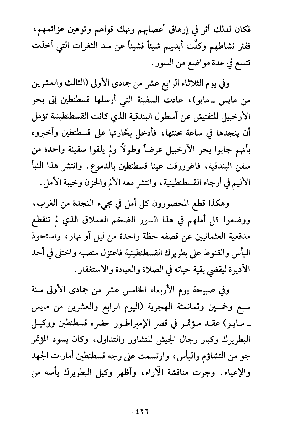وفي يوم الثلاثاء الرابع عشر من جمادى الأولى (الثالث والعشرين من مايس - مايو)، عادت السفينة التي أرسلها قسطنطين إلى بحر الأرخبيل للتفتيش عن أسطول البندقية الذي كانت القسطنطينية تؤمل أن ينجدها في ساعة محنتها، فأدخل بحَّارتها على قسطنطين وأخبروه بأنهم جابوا بحر الأرخبيل عرضاً وطولاً ولم يلقوا سفينة واحدة من سفن البندقية، فاغرورقت عينا قسطنطين بالدموع. وانتشر هذا النبأ الأليم في أرجاء القسطنطينية، وانتشر معه الألم والحزن وخيبة الأمل.