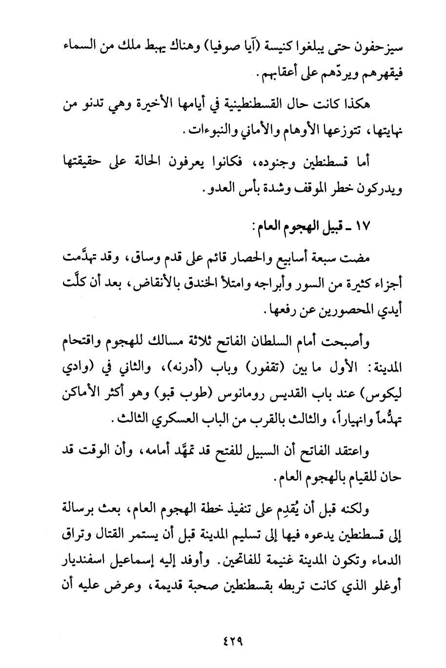 وأصبحت أمام السلطان الفاتح ثلاثة مسالك للهجوم واقتحام المدينة: الأول ما بين (تقفور) وباب (أدرنه)، والثاني في (وادي ليكوس) عند باب القديس رومانوس (طوب قبو) وهو أكثر الأماكن تهدُّماً وانهياراً، والثالث بالقرب من الباب العسكري الثالث.