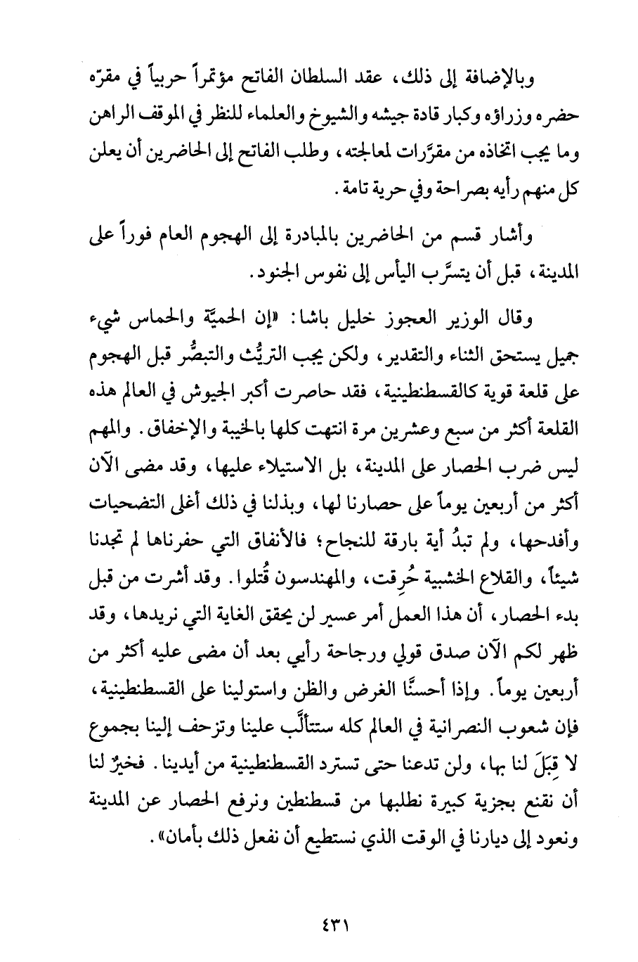 وقال الوزير العجوز خليل باشا: "إن الحميَّة والحماس شيء جميل يستحق الثناء والتقدير، ولكن يجب التريُّث والتبصُّر قبل الهجوم على قلعة قوية كالقسطنطينية، فقد حاصرت أكبر الجيوش في العالم هذه القلعة أكثر من سبع وعشرين مرة انتهت كلها بالخيبة والإخفاق. والمهم ليس ضرب الحصار على المدينة، بل الاستيلاء عليها، وقد مضى الآن أكثر من أربعين يوماً على حصارنا لها، وبذلنا في ذلك أغلى التضحيات وأفدحها، ولم تبدُ أية بارقة للنجاح؛ فالأنفاق التي حفرناها لم تجدنا شيئاً، والقلاع الخشبية حُرِقت، والمهندسون قُتلوا. وقد أشرت من قبل بدء الحصار، أن هذا العمل أمر عسير لن يحقق الغاية التي نريدها، وقد ظهر لكم الآن صدق قولي ورجاحة رأيي بعد أن مضى عليه أكثر من أربعين يوماً. وإذا أحسنَّا الغرض والظن واستولينا على القسطنطينية، فإن شعوب النصرانية في العالم كله ستتألَّب علينا وتزحف إلينا بجموع لا قِبَلَ لنا بها، ولن تدعنا حتى تسترد القسطنطينية من أيدينا. فخيرٌ لنا أن نقنع بجزية كبيرة نطلبها من قسطنطين ونرفع الحصار عن المدينة ونعود إلى ديارنا في الوقت الذي نستطيع أن نفعل ذلك بأمان".