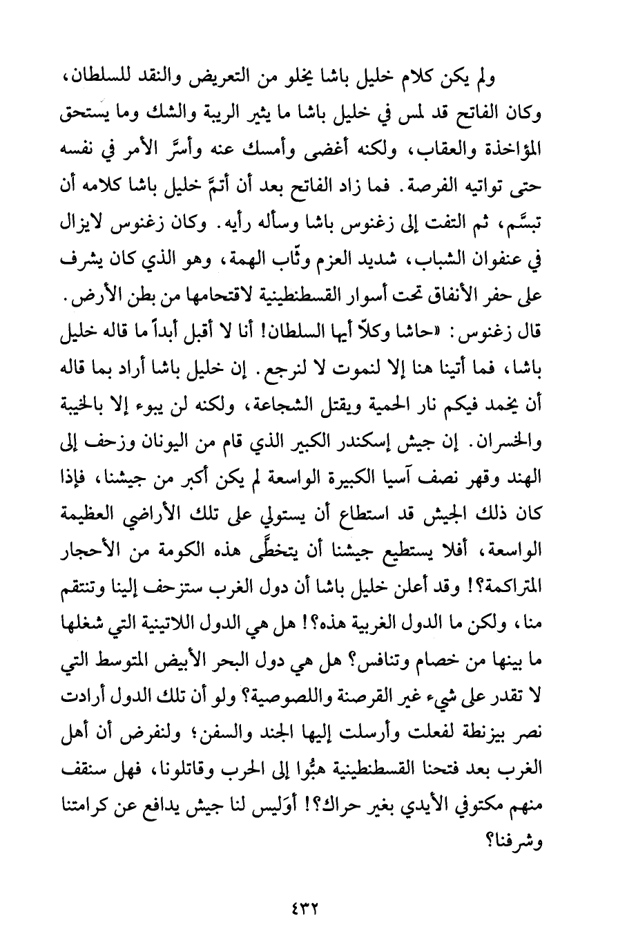 قال زغنوس: "حاشا وكلاّ أيها السلطان! أنا لا أقبل أبداً ما قاله خليل باشا، فما أتينا هنا إلا لنموت لا لنرجع. إن خليل باشا أراد بما قاله أن يخمد فيكم نار الحمية ويقتل الشجاعة، ولكنه لن يبوء إلا بالخيبة والخسران. إن جيش إسكندر الكبير الذي قام من اليونان وزحف إلى الهند وقهر نصف آسيا الكبيرة الواسعة لم يكن أكبر من جيشنا، فإذا كان ذلك الجيش قد استطاع أن يستولي على تلك الأراضي العظيمة الواسعة، أفلا يستطيع جيشنا أن يتخطَّى هذه الكومة من الأحجار المتراكمة؟! وقد أعلن خليل باشا أن دول الغرب ستزحف إلينا وتنتقم منا، ولكن ما الدول الغربية هذه؟! هل هي الدول اللاتينية التي شغلها ما بينها من خصام وتنافس؟ هل هي دول البحر الأبيض المتوسط التي لا تقدر على شيء غير القرصنة واللصوصية؟ ولو أن تلك الدول أرادت نصر بيزنطة لفعلت وأرسلت إليها الجند والسفن؛ ولنفرض أن أهل الغرب بعد فتحنا القسطنطينية هبُّوا إلى الحرب وقاتلونا، فهل سنقف منهم مكتوفي الأيدي بغير حراك؟! أوَليس لنا جيش يدافع عن كرامتنا وشرفنا؟