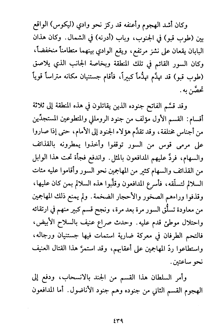 وكان أشد الهجوم وأعنفه قد ركز نحو وادي (ليكوس) الواقع بين (طوب قبو) في الجنوب، وباب (أدرنه) في الشمال. وكان هذان البابان يقعان على نشز مرتفع، ويقع الوادي بينهما متطامناً منخفضاً، وكان السور القائم في تلك المنطقة وبخاصة الجانب الذي يلاصق (طوب قبو) قد تهدَّم تهدُّماً كبيراً، فأقام جستنيان مكانه متراساً قوياً تحصَّن به.