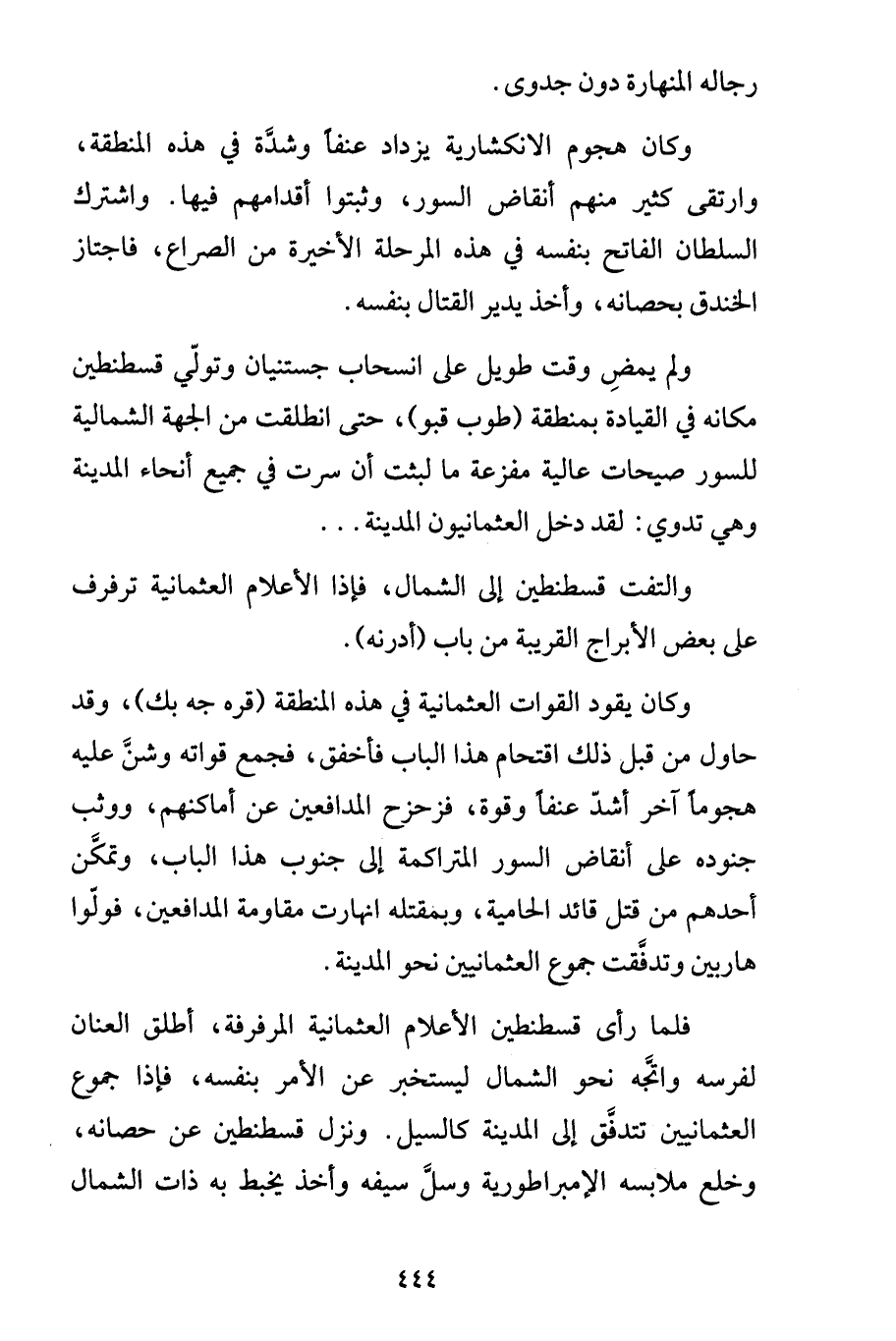 وكان هجوم الانكشارية يزداد عنفاً وشدَّة في هذه المنطقة، وارتقى كثير منهم أنقاض السور، وثبتوا أقدامهم فيها. واشترك السلطان الفاتح بنفسه في هذه المرحلة الأخيرة من الصراع، فاجتاز الخندق بحصانه، وأخذ يدير القتال بنفسه.