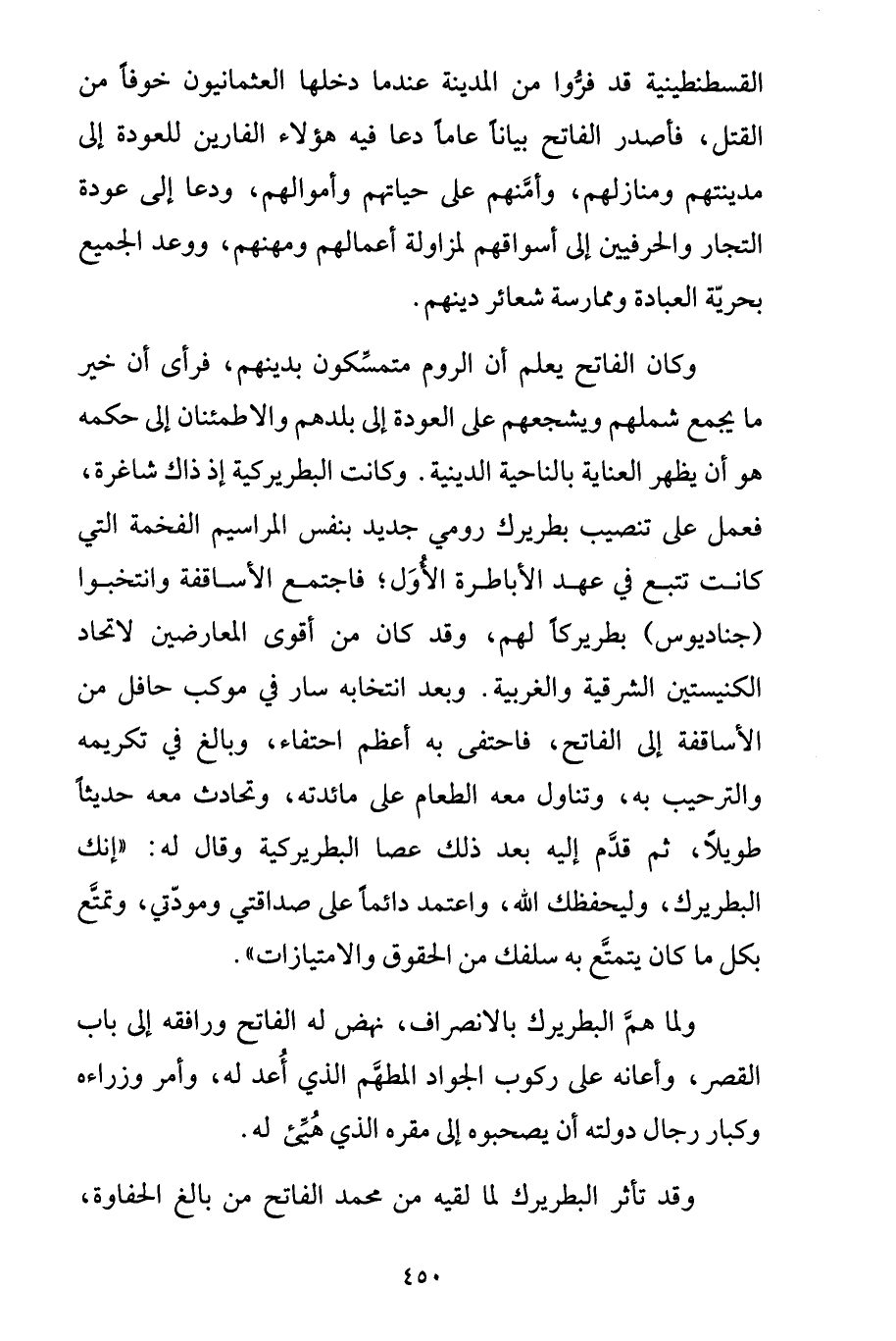 ولما همَّ البطريرك بالانصراف، نهض له الفاتح ورافقه إلى باب القصر، وأعانه على ركوب الجواد المطهَّم الذي أُعد له، وأمر وزراءه وكبار رجال دولته أن يصحبوه إلى مقره الذي هُيِّئ له.
