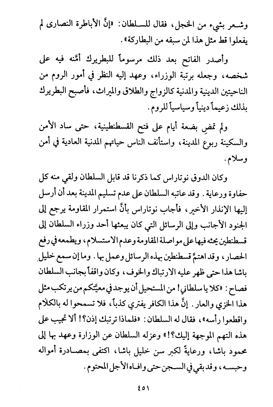 وشعر بشيء من الخجل، فقال للسلطان: "إنَّ الأباطرة النصارى لم يفعلوا قط مثل هذا لمن سبقه من البطاركة".