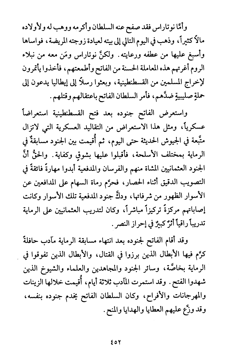 واستعرض الفاتح جنوده بعد فتح القسطنطينية استعراضاً عسكرياً، ومثل هذا الاستعراض من التقاليد العسكرية التي لا تزال متَّبعة في الجيوش الحديثة حتى اليوم، ثم أُقيمت بين الجنود مسابقة في الرماية بمختلف الأسلحة، فأقبلوا عليها بشوقٍ وكفاية. والحقُّ أنَّ الجنود العثمانيين المشاة منهم والفرسان والمدفعية أبدوا مهارةً فائقةً في التصويب الدقيق أثناء الحصار، فحرَّم رماة السهام على المدافعين عن الأسوار الظهور من شرفاتها، ودكَّ جنود المدفعية تلك الأسوار وكانت إصاباتهم مركزةً تركيزاً مباشراً، وكان لتدريب العثمانيين على الرماية تدريباً راقياً أثرٌ كبيرٌ في إحراز النصر.