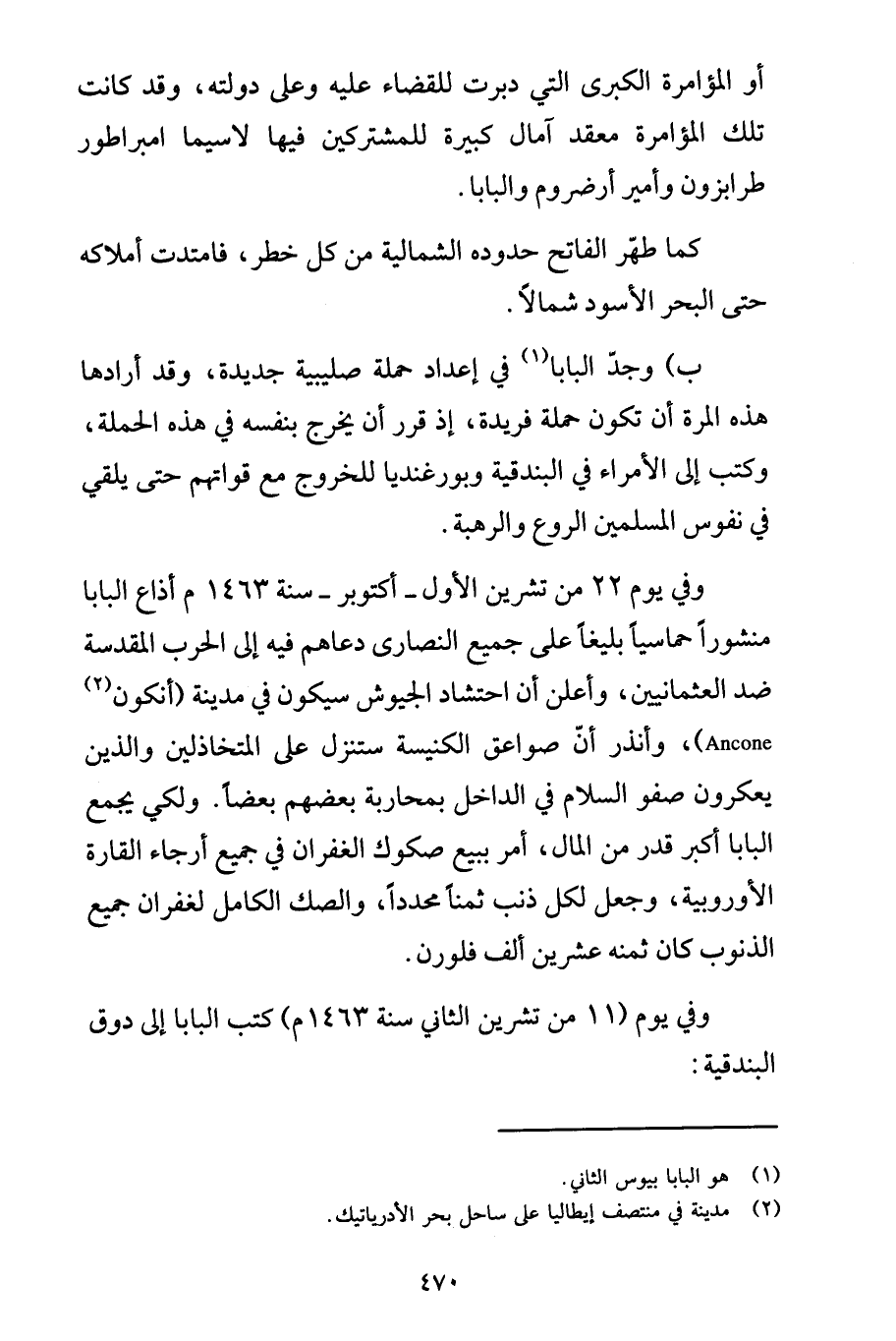 وفي يوم 22 من تشرين الأول - أكتوبر - سنة 1463 م أذاع البابا منشوراً حماسياً بليغاً على جميع النصارى دعاهم فيه إلى الحرب المقدسة ضد العثمانيين، وأعلن أن احتشاد الجيوش سيكون في مدينة (أنكون (2) Ancone) ، وأنذر أنّ صواعق الكنيسة ستنزل على المتخاذلين والذين يعكرون صفو السلام في الداخل بمحاربة بعضهم بعضاً. ولكي يجمع البابا أكبر قدر من المال، أمر ببيع صكوك الغفران في جميع أرجاء القارة الأوروبية، وجعل لكل ذنب ثمناً محدداً، والصك الكامل لغفران جميع الذنوب كان ثمنه عشرين ألف فلورن.