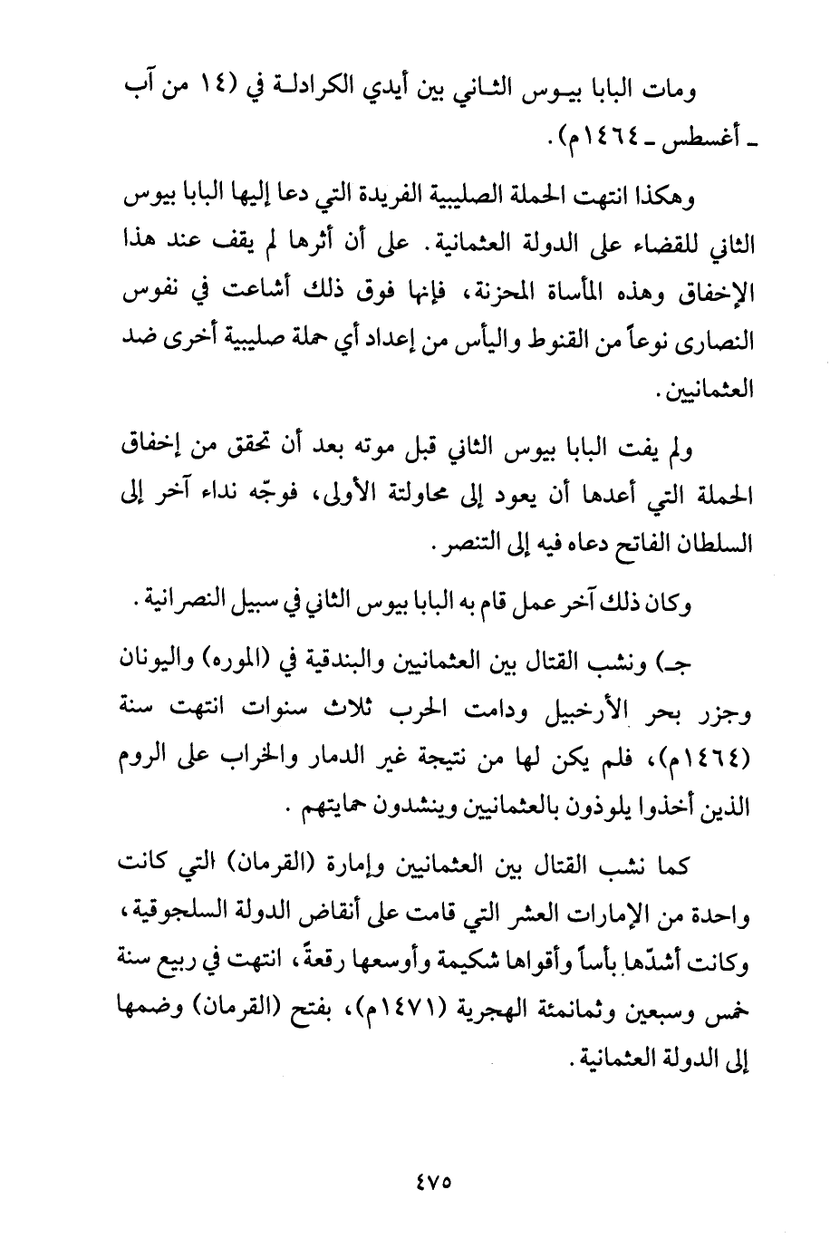 ج) ونشب القتال بين العثمانيين والبندقية في (الموره) واليونان وجزر بحر الأرخبيل ودامت الحرب ثلاث سنوات انتهت سنة (1464م)، فلم يكن لها من نتيجة غير الدمار والخراب على الروم الذين أخذوا يلوذون بالعثمانيين وينشدون حمايتهم.