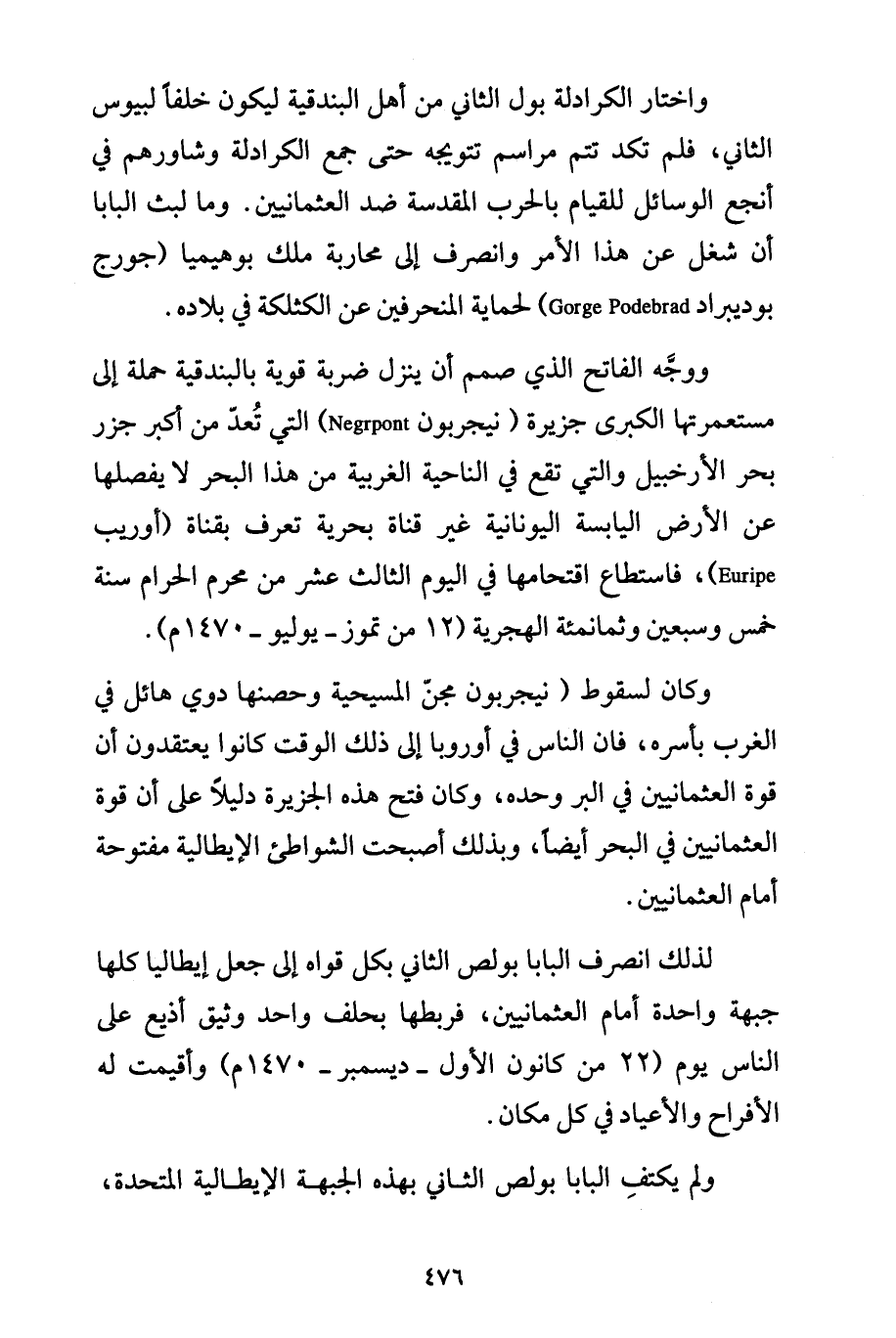 ووجَّه الفاتح الذي صمم أن ينزل ضربة قوية بالبندقية حملة إلى مستعمرتها الكبرى جزيرة (نيجربون Negrpont) التي تُعدّ من أكبر جزر بحر الأرخبيل والتي تقع في الناحية الغربية من هذا البحر لا يفصلها عن الأرض اليابسة اليونانية غير قناة بحرية تعرف بقناة (أوريب Euripe) ، فاستطاع اقتحامها في اليوم الثالث عشر من محرم الحرام سنة خمس وسبعين وثمانمئة الهجرية (12 من تموز - يوليو - 1470م).