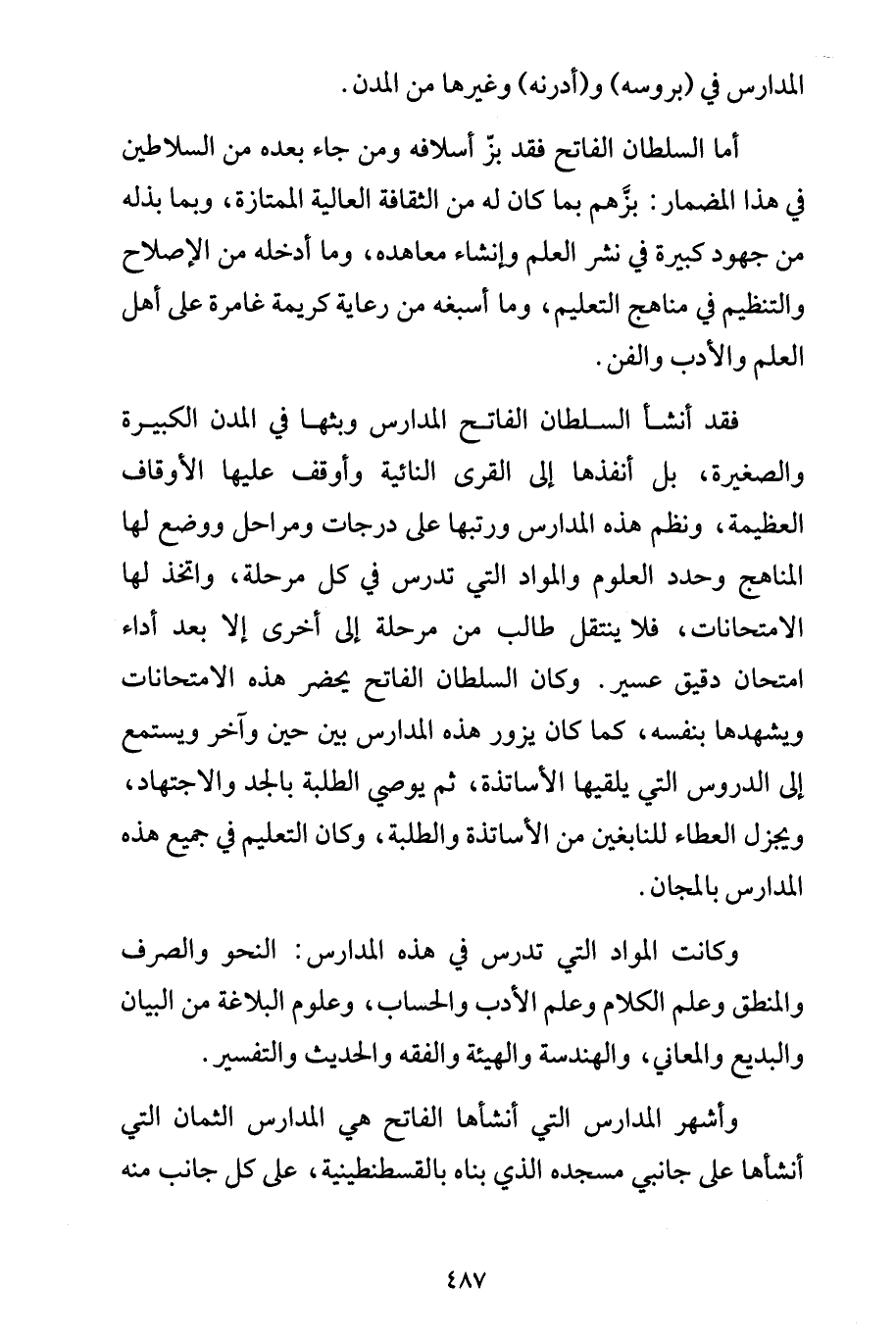 أما السلطان الفاتح فقد بزّ أسلافه ومن جاء بعده من السلاطين في هذا المضمار: بزَّهم بما كان له من الثقافة العالية الممتازة، وبما بذله من جهود كبيرة في نشر العلم وإنشاء معاهده، وما أدخله من الإصلاح والتنظيم في مناهج التعليم، وما أسبغه من رعاية كريمة غامرة على أهل العلم والأدب والفن.