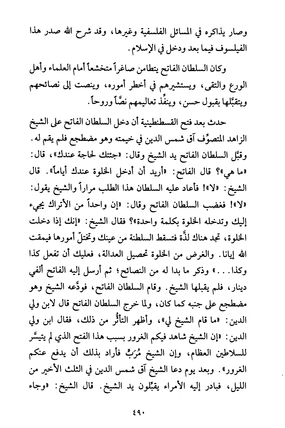 وكان السلطان الفاتح يتطامن صاغراً متخشعاً أمام العلماء وأهل الورع والتقى، ويستشيرهم في أخطر أموره، وينصت إلى نصائحهم ويتقبَّلها بقبول حسن، وينفذ تعاليمهم نصّاً وروحاً.