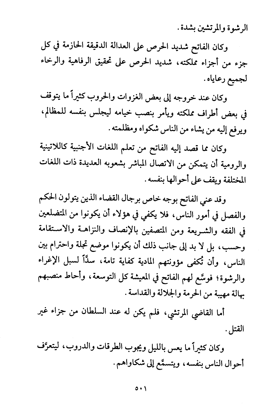 وكان الفاتح شديد الحرص على العدالة الدقيقة الحازمة في كل جزء من أجزاء مملكته، شديد الحرص على تحقيق الرفاهية والرخاء لجميع رعاياه.