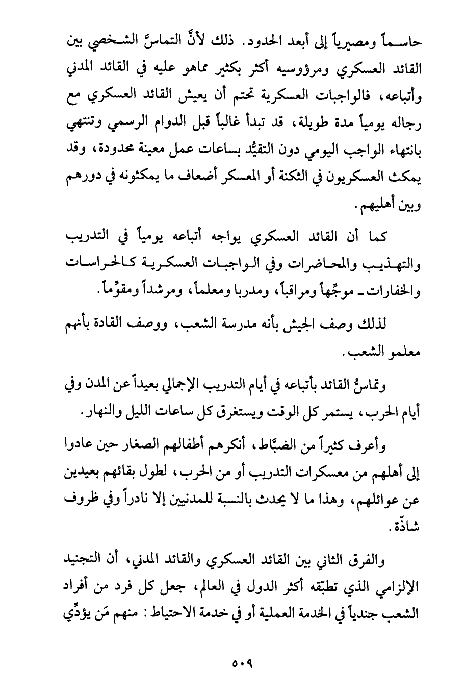 حاسماً ومصيرياً إلى أبعد الحدود. ذلك لأن التماسَّ الشخصي بين القائد العسكري ومرؤوسيه أكثر بكثير مما هو عليه في القائد المدني وأتباعه، فالواجبات العسكرية تحتم أن يعيش القائد العسكري مع رجاله يومياً مدة طويلة، قد تبدأ غالباً قبل الدوام الرسمي وتنتهي بانتهاء الواجب اليومي دون التقيُّد بساعات عمل معينة محدودة، وقد يمكث العسكريون في الثكنة أو المعسكر أضعاف ما يمكثونه في دورهم وبين أهليهم.