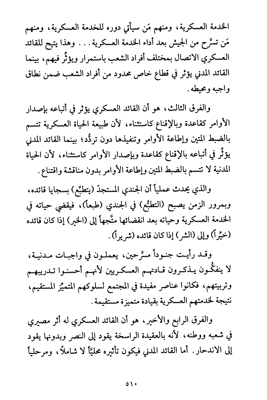 الخدمة العسكرية، ومنهم مَن سيأتي دوره للخدمة العسكرية، ومنهم مَن تسرَّح من الجيش بعد أداء الخدمة العسكرية ... وهذا يتيح للقائد العسكري الاتصال بمختلف أفراد الشعب باستمرار ويؤثِّر فيهم، بينما القائد المدني يؤثر في قطاع خاص محدود من أفراد الشعب ضمن نطاق واجبه ومحيطه.