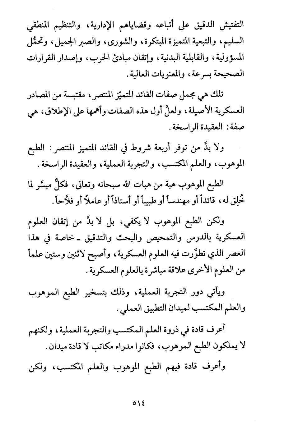 ولا بدَّ من توفر أربعة شروط في القائد المتميز المنتصر: الطبع الموهوب، والعلم المكتسب، والتجربة العملية، والعقيدة الراسخة.