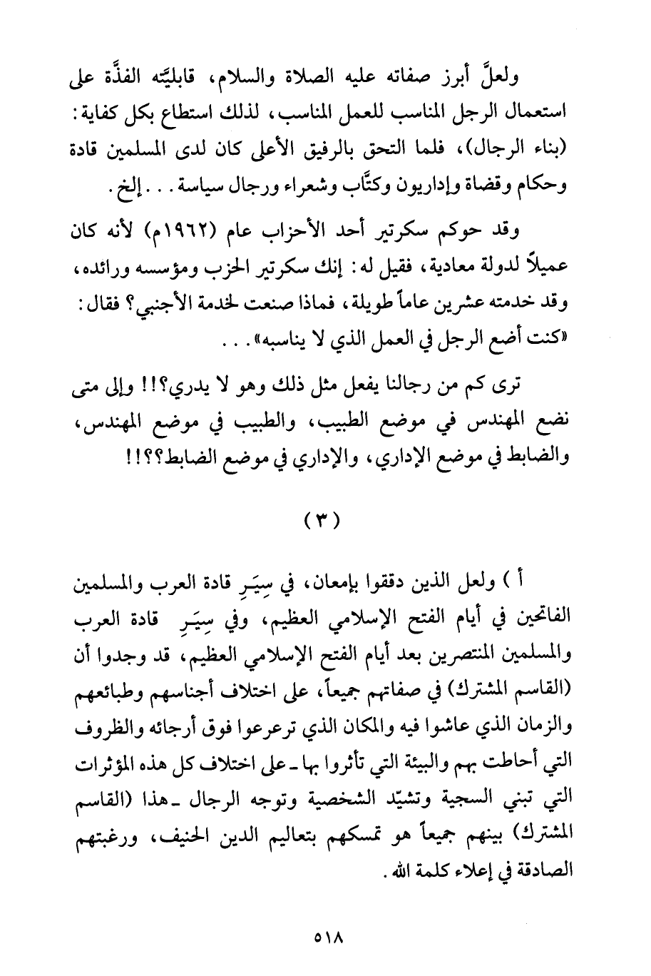 أ) ولعل الذين دققوا بإمعان، في سِيَرِ قادة العرب والمسلمين الفاتحين في أيام الفتح الإسلامي العظيم، وفي سِيَرِ قادة العرب والمسلمين المنتصرين بعد أيام الفتح الإسلامي العظيم، قد وجدوا أن (القاسم المشترك) في صفاتهم جميعاً، على اختلاف أجناسهم وطبائعهم والزمان الذي عاشوا فيه والمكان الذي ترعرعوا فوق أرجائه والظروف التي أحاطت بهم والبيئة التي تأثروا بها - على اختلاف كل هذه المؤثرات التي تبني السجية وتشيّد الشخصية وتوجه الرجال - هذا (القاسم المشترك) بينهم جميعاً هو تمسكهم بتعاليم الدين الحنيف، ورغبتهم الصادقة في إعلاء كلمة الله.