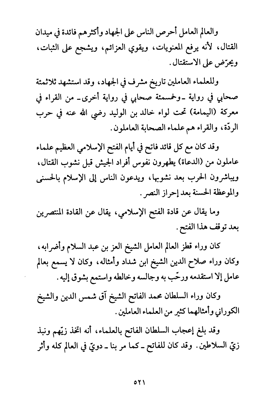 والعالم العامل أحرص الناس على الجهاد وأكثرهم فائدة في ميدان القتال، لأنه يرفع المعنويات، ويقوي العزائم، ويشجع على الثبات، ويحرّض على الاستقتال.