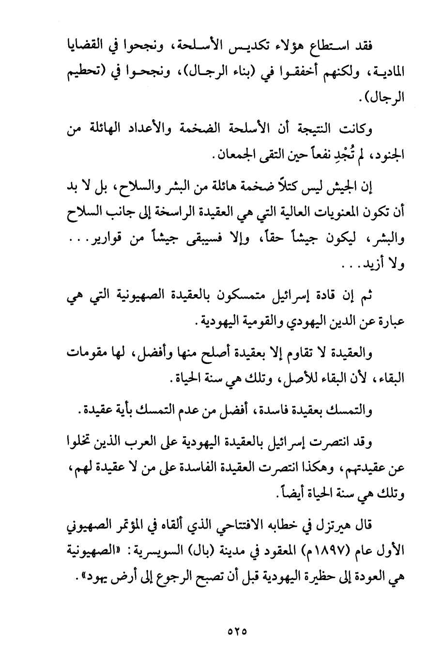 إن الجيش ليس كتلاً ضخمة هائلة من البشر والسلاح، بل لا بد أن تكون المعنويات العالية التي هي العقيدة الراسخة إلى جانب السلاح والبشر، ليكون جيشاً حقاً، وإلا فسيبقى جيشاً من قوارير ... ولا أزيد ... ثم إن قادة إسرائيل متمسكون بالعقيدة الصهيونية التي هي عبارة عن الدين اليهودي والقومية اليهودية.