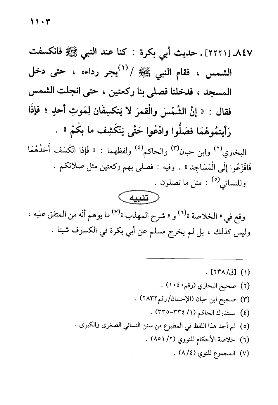 847 - [2221]- حديث أبي بكرة: كنا عند النبي - صلى الله عليه وسلم - فانكسفت الشمس، فقام النبي - صلى الله عليه وسلم - / (¬1) يجر رداءه، حتى دخل المسجد، فدخلنا فصلى بنا ركعتين، حتى انجلت الشمس فقال: "إن الشَّمْسَ والْقمرَ لا يَنكسِفَان لِمَوتِ أحدٍ؛ فإذَا رَأيتمُوهُمَا فصَلُّوا وادْعُوا حَتى يَنْكَشِف ما بكْمْ".