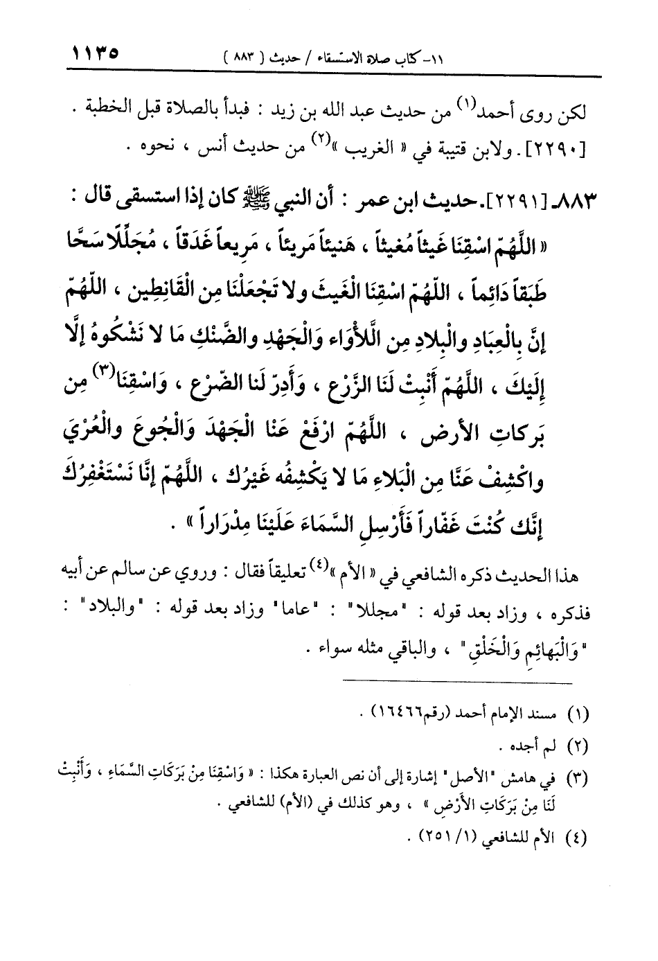 (¬3) في هامش "الأصل" إشارة إلى أن نص العبارة هكذا: "وَاسْقِنَا مِنْ بَرَكَاتِ السَّمَاءِ، وَأَنْبِتْ لَنَا من بَرَكَاتِ الأَرْضِ"، وهو كذلك في (الأم) للشافعي.