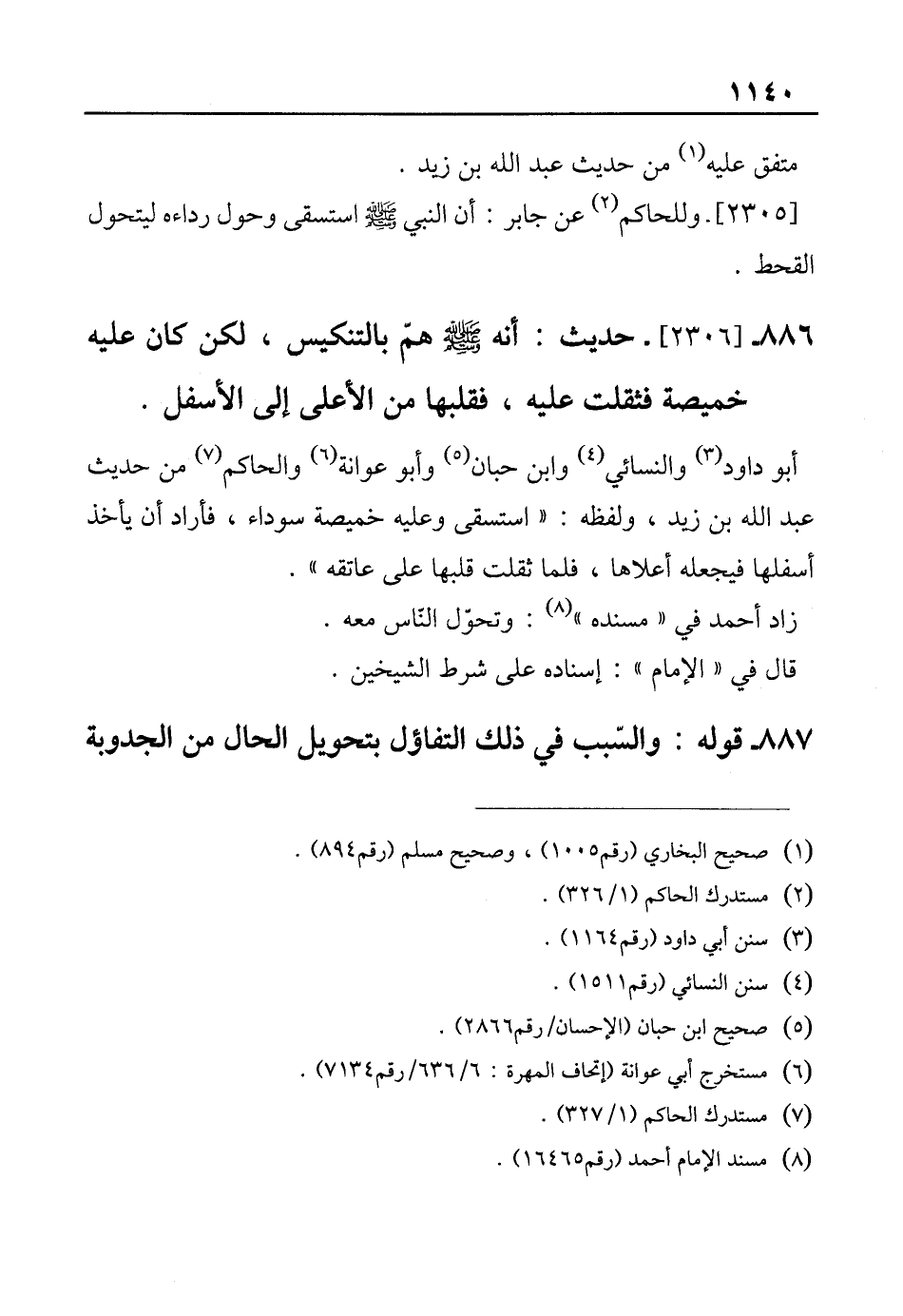 [2305]- وللحاكم (¬2) عن جابر: أن النبي - صلي الله عليه وسلم - استسقى وحول رداءه ليتحول القحط.