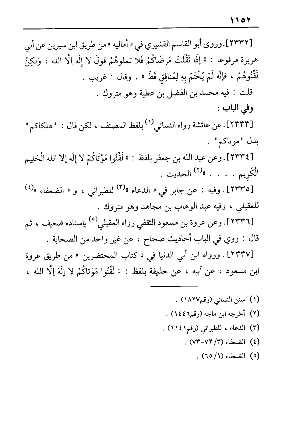 [2337]- ورواه ابن أبي الدنيا في "كتاب المحتضرين" من طريق عروة ابن مسعود، عن أبيه، عن حذيفة بلفظ: "لَقِّنُوا مَوْتاكُمْ لا إلَهَ إلاَّ الله،