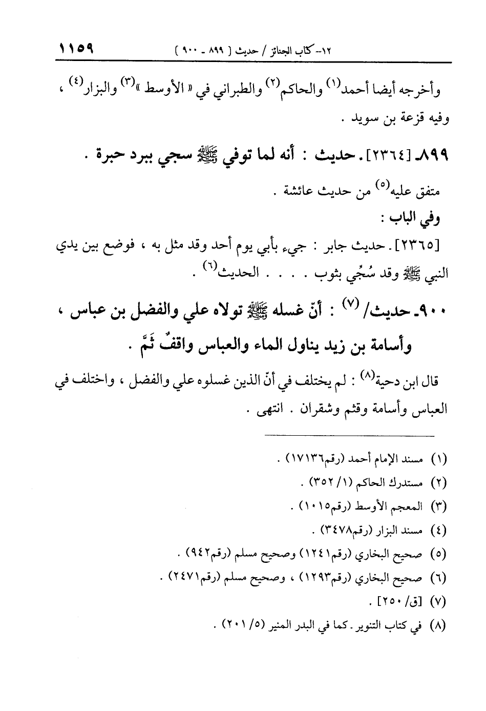 900 - حديث/ (¬7): أنّ غسله - صلي الله عليه وسلم - تولاه علي والفضل بن عباس، وأسامة بن زيد يناول الماء والعباس واقفٌ ثَمَّ.
