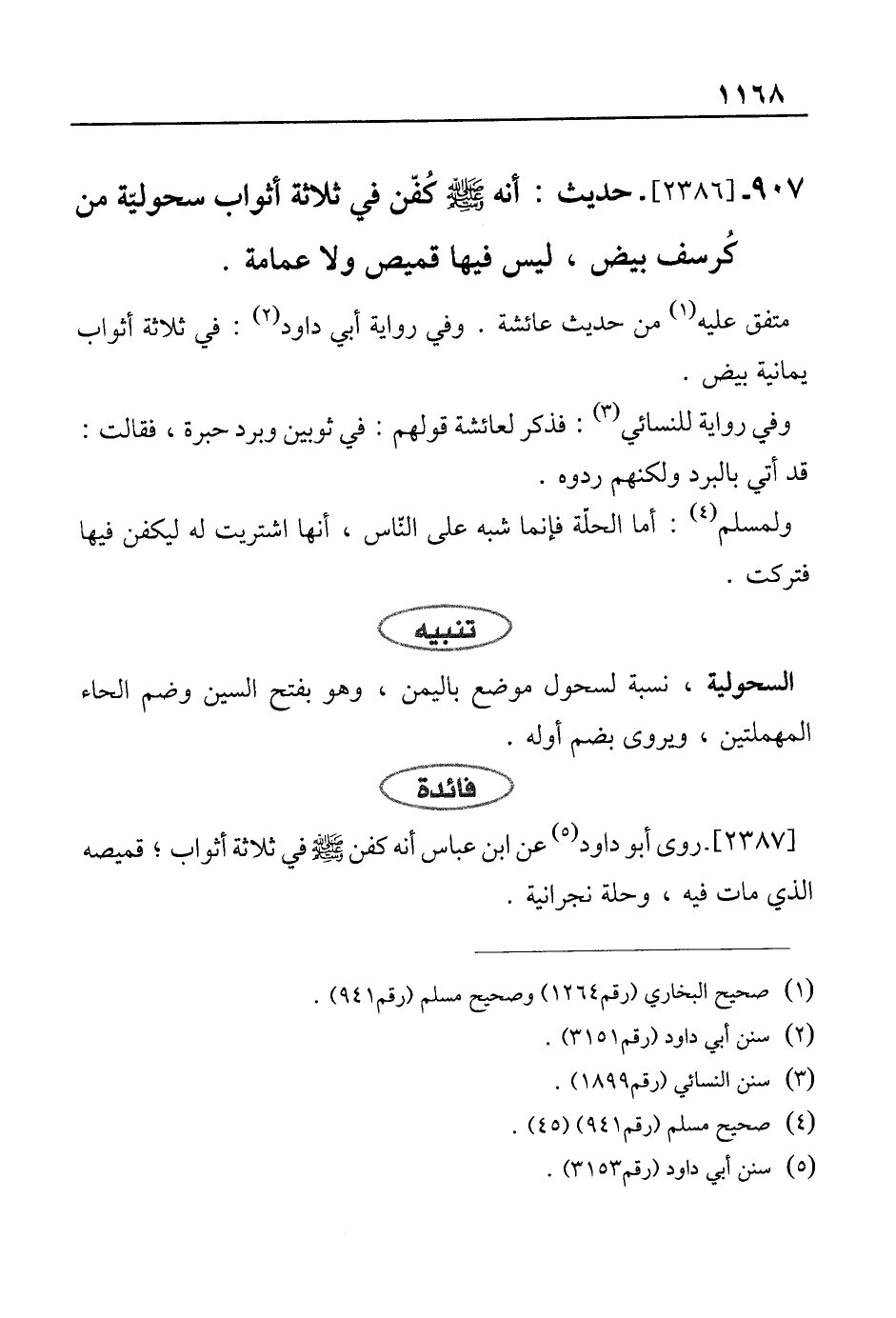 907 - [2386]- حديث: أنه - صلى الله عليه وسلم- كُفّن في ثلاثة أثواب سحوليّة من كُرسف بيض، ليس فيها قميص ولا عمامة.