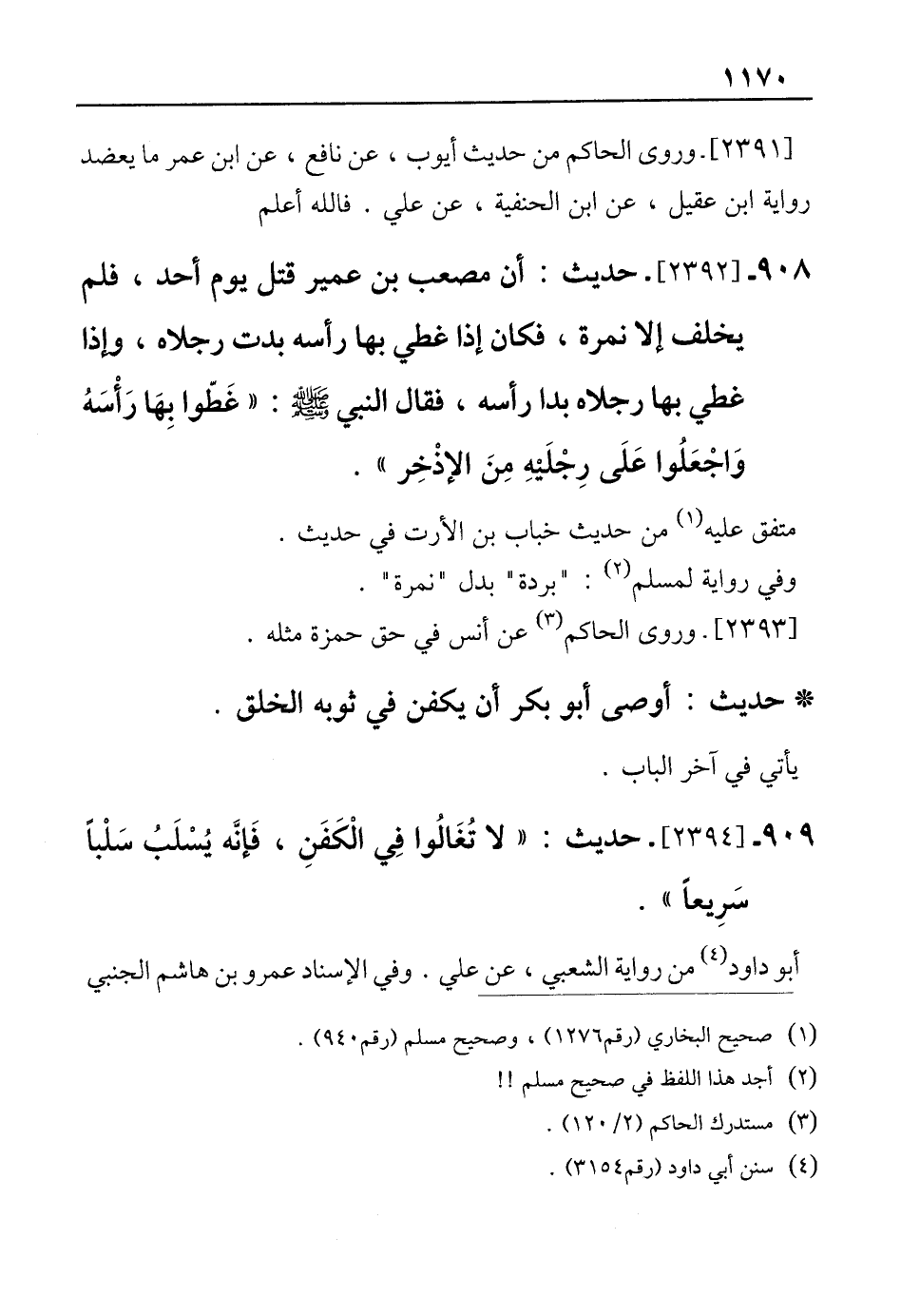 909 - [2394]- حديث: "لا تُغَالُوا في الْكَفَنِ، فَإنَّه يُسْلَبُ سَلْباً سَرِيعا".