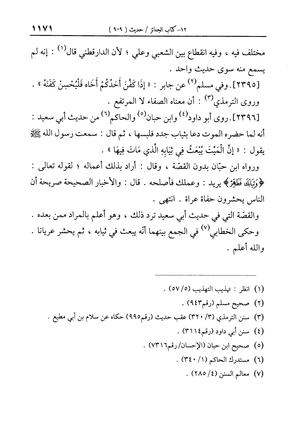 [2396]- روى أبو داود (¬4) وابن حبانْ (¬5) والحاكم (¬6) من حديث أبي سعيد: أنه لما حضره الموت دعا بثياب جدد فلبسها، ثم قال: سمعت رسول الله - صلى الله عليه وسلم - يقول: "إنَّ الْمَيِّتَ يُبْعَثُ في ثِيَابِهِ الَّذي مَاتَ فِيهَا".