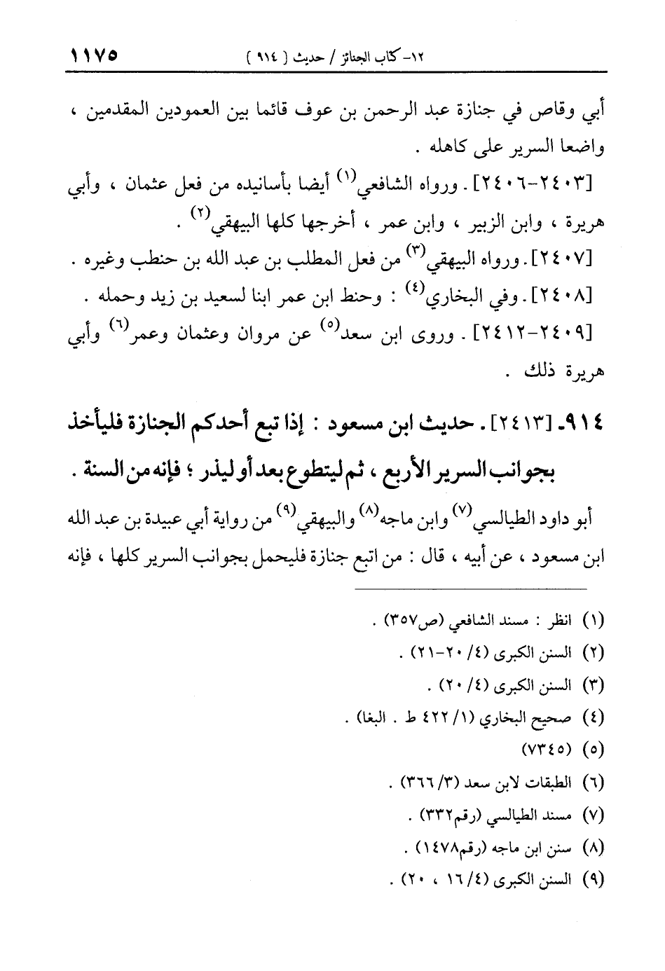 914 - [2413]- حديث ابن مسعود: إذا تبع أحدكم الجنازة فلياخذ بجوانب السرير الأربع، ثم ليتطوع بعد أو ليذر؛ فإنه من السنة.