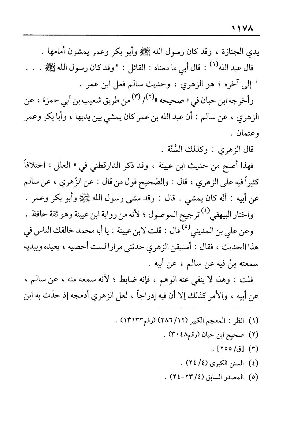 وأخرجه ابن حبان في "صحيحه" (¬2) / (¬3) من طريق شعيب بن أبي حمزة، عن الزهري، عن سالم: أن عبد الله بن عمر كان يمشي بين يديها، وأبا بكر وعمر وعثمان.