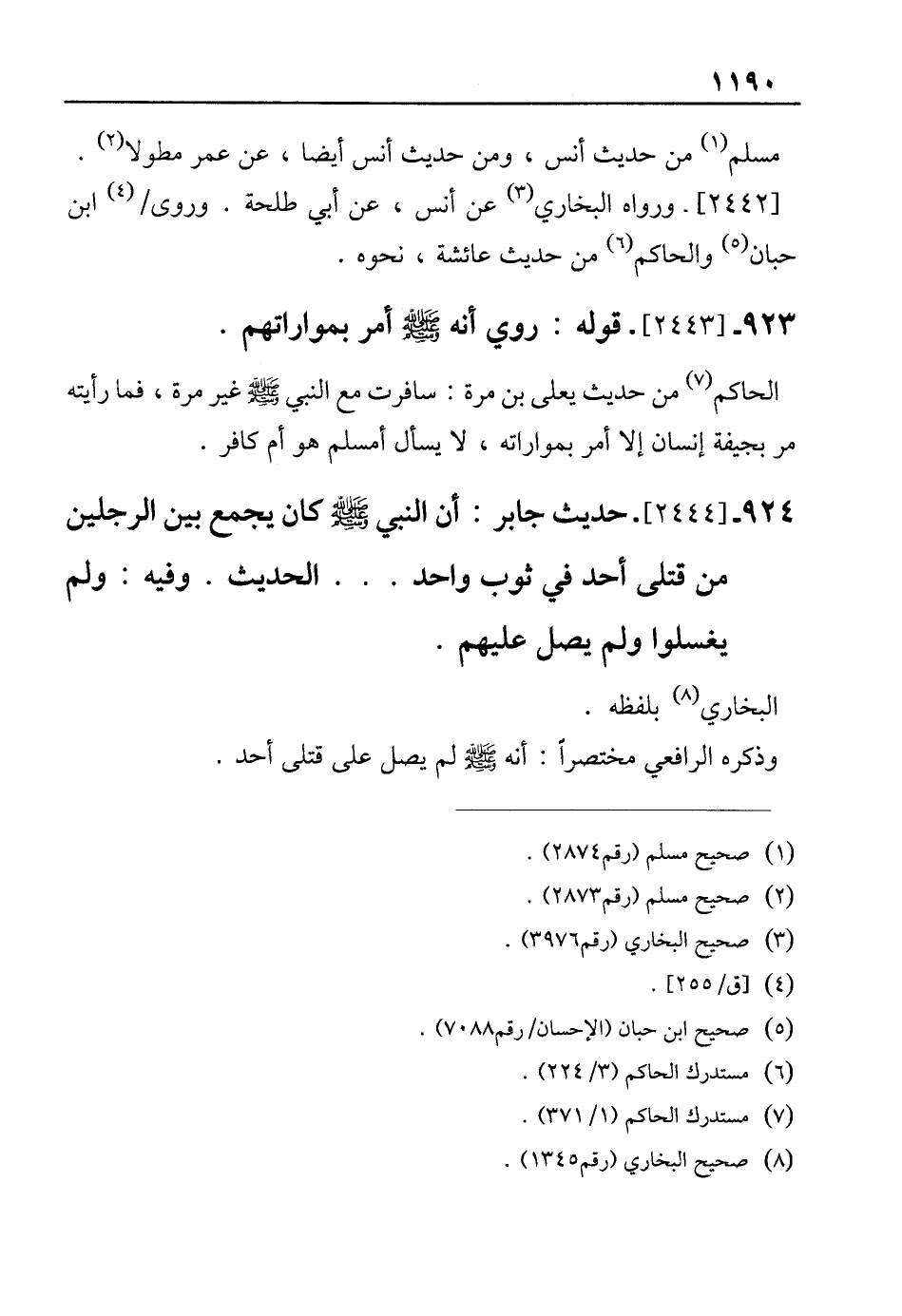 924 - [2444]- حديث جابر: أن النبي-صلى الله عليه وسلم- كان يجمع بين الرجلين من قتلى أحد في ثوب واحد ... الحديث. وفيه: ولم يغسلوا ولم يصل عليهم.