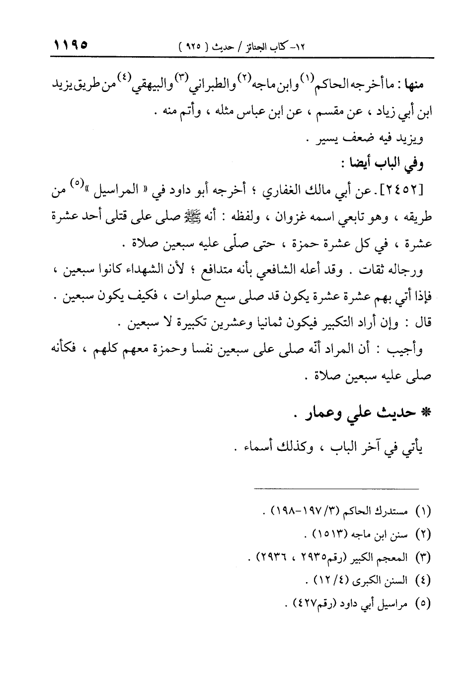[2452]- عن أبي مالك الغفاري؛ أخرجه أبو داود في "المراسيل" (¬5) من طريقه، وهو تابعي اسمه غزوان، ولفظه: أنه في - صلى الله عليه وسلم - صلى على قتلى أحد عشرة عشرة، في كل عشرة حمزة، حتى صلى عليه سبعين صلاة.