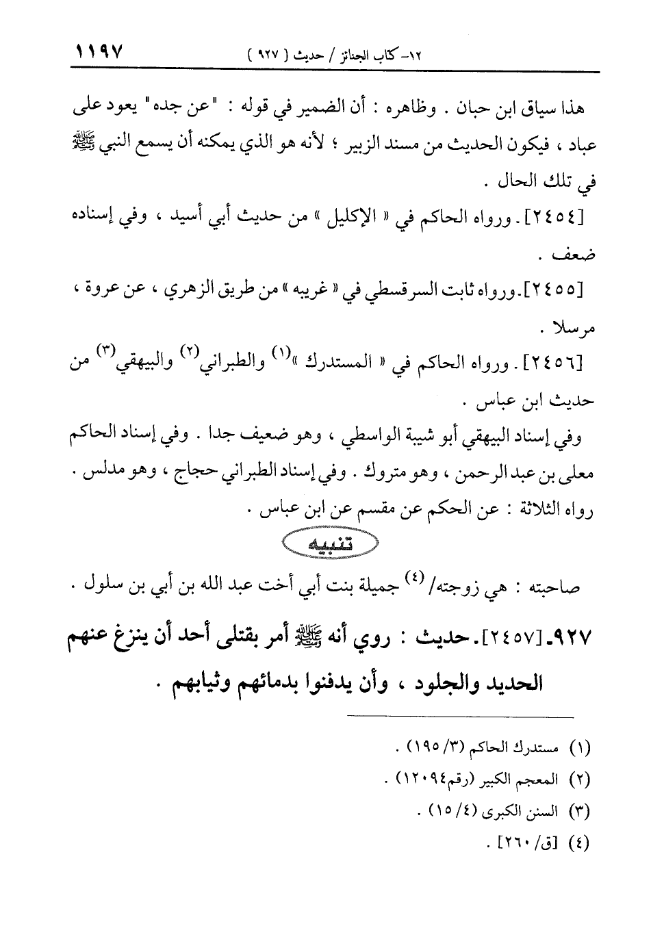 927 - [2457]- حديث: روي أنه - صلى الله عليه وسلم - أمر بقتلى أحد أن ينزغ عنهم الحديد والجلود، وأن يدفنوا بدمائهم وثيابهم.