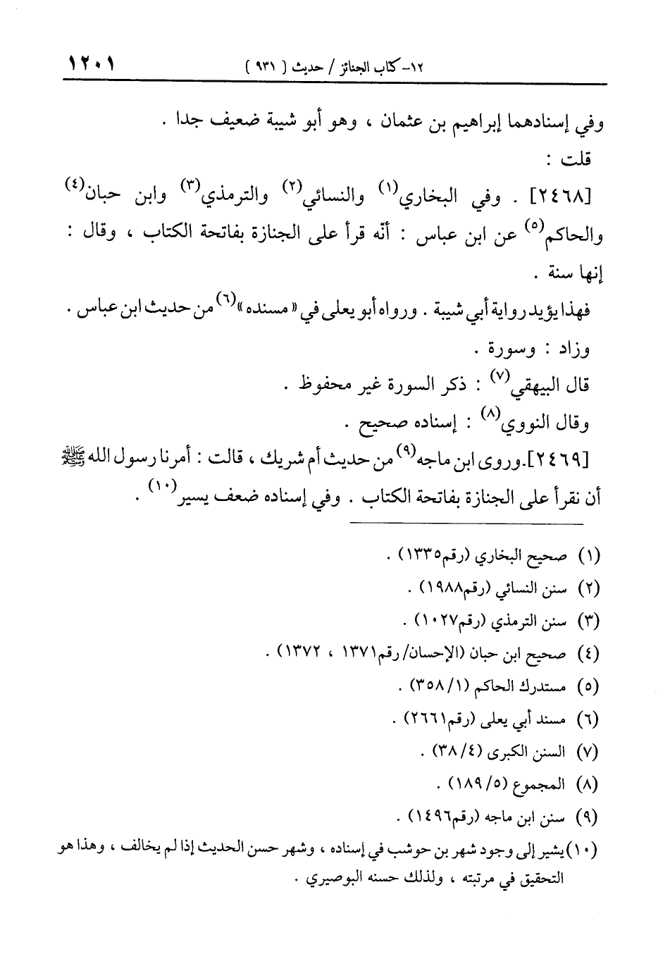 [2469]- وروى ابن ماجه (¬9) من حديث أم شريك، قا لت: أمرنا رسول الله-صلى الله عليه وسلم- أن نقرأ على الجنازة بفاتحة الكتاب. وفي إسناده ضعف يسير (¬10).