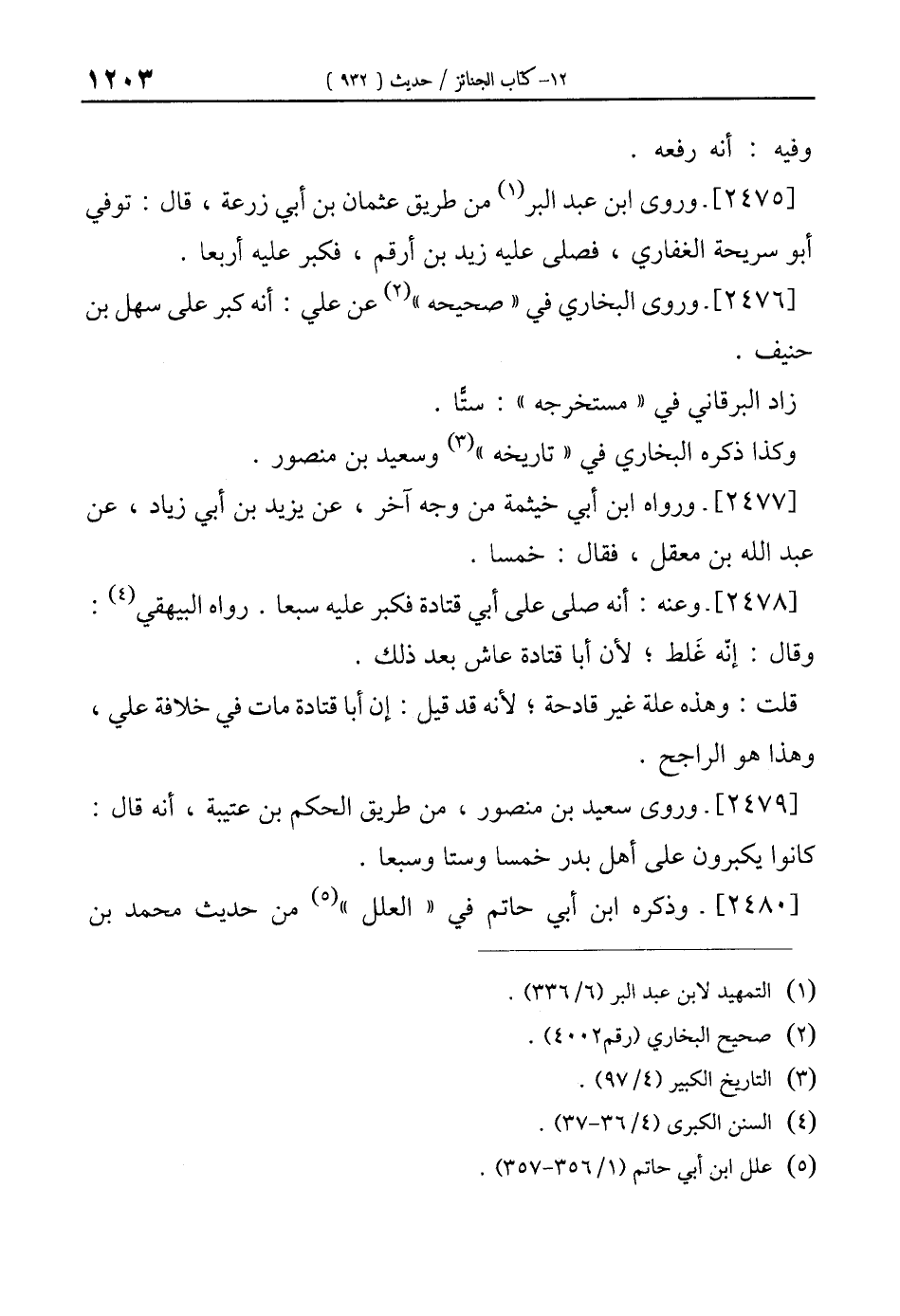 [2479]- وروى سعيد بن منصور، من طريق الحكم بن عتيبة، أنه قال: كانوا يكبرون على أهل بدر خمساً وستاً وسبعا.