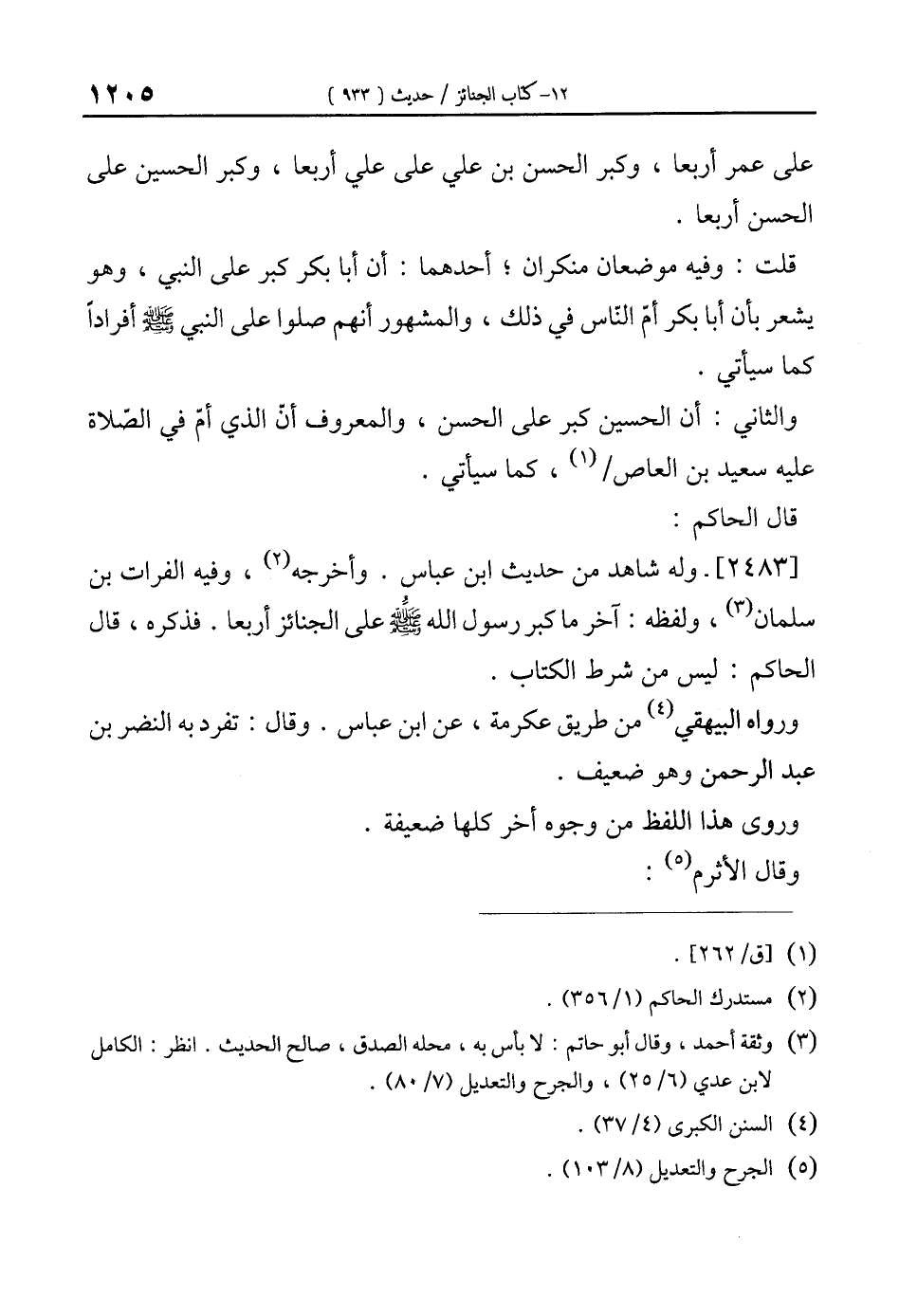 [2483]- وله شاهد من حديث ابن عباس. وأخرجه (¬2)، وفيه الفرات بن سلمان (¬3)، ولفظه: آخر ما كبر رسول الله-صلى الله عليه وسلم- على الجنائز أربعا. فذكره، قال الحاكم: ليس من شرط الكتاب.