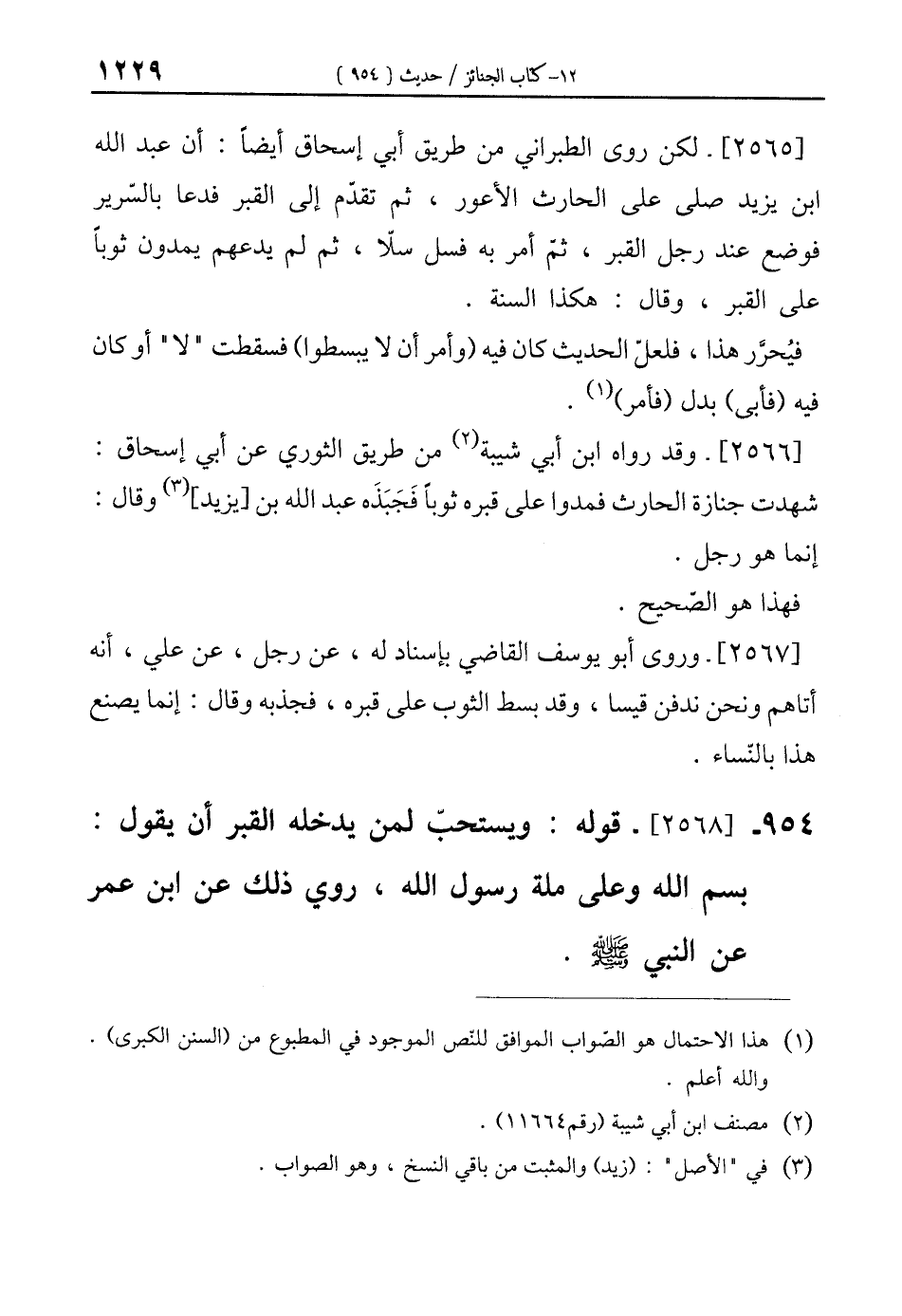 954 - [2568]- قوله: ويستحبّ لمن يدخله القبر يقول: بسم الله وعلى ملة رسول الله-صلى الله عليه وسلم-، روي ذلك عن ابن عمر عن النبي-صلى الله عليه وسلم.