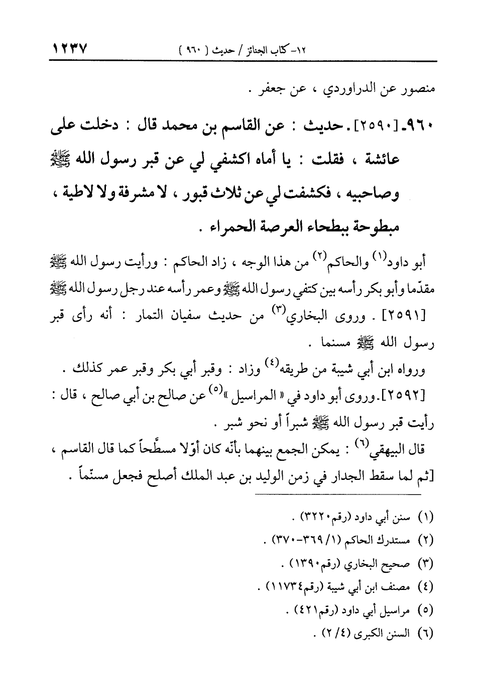 960 - [2590]- حديث: عن القاسم بن محمَّد قال: دخلت على عائشة، فقلت: يا أماه اكشفي لي عن قبر رسول الله-صلى الله عليه وسلم- وصاحبيه، فكشفت لي عن ثلاث قبور، لا مشوفة ولا لاطية، مبطوحة ببطحاء العرصة الحمراء.