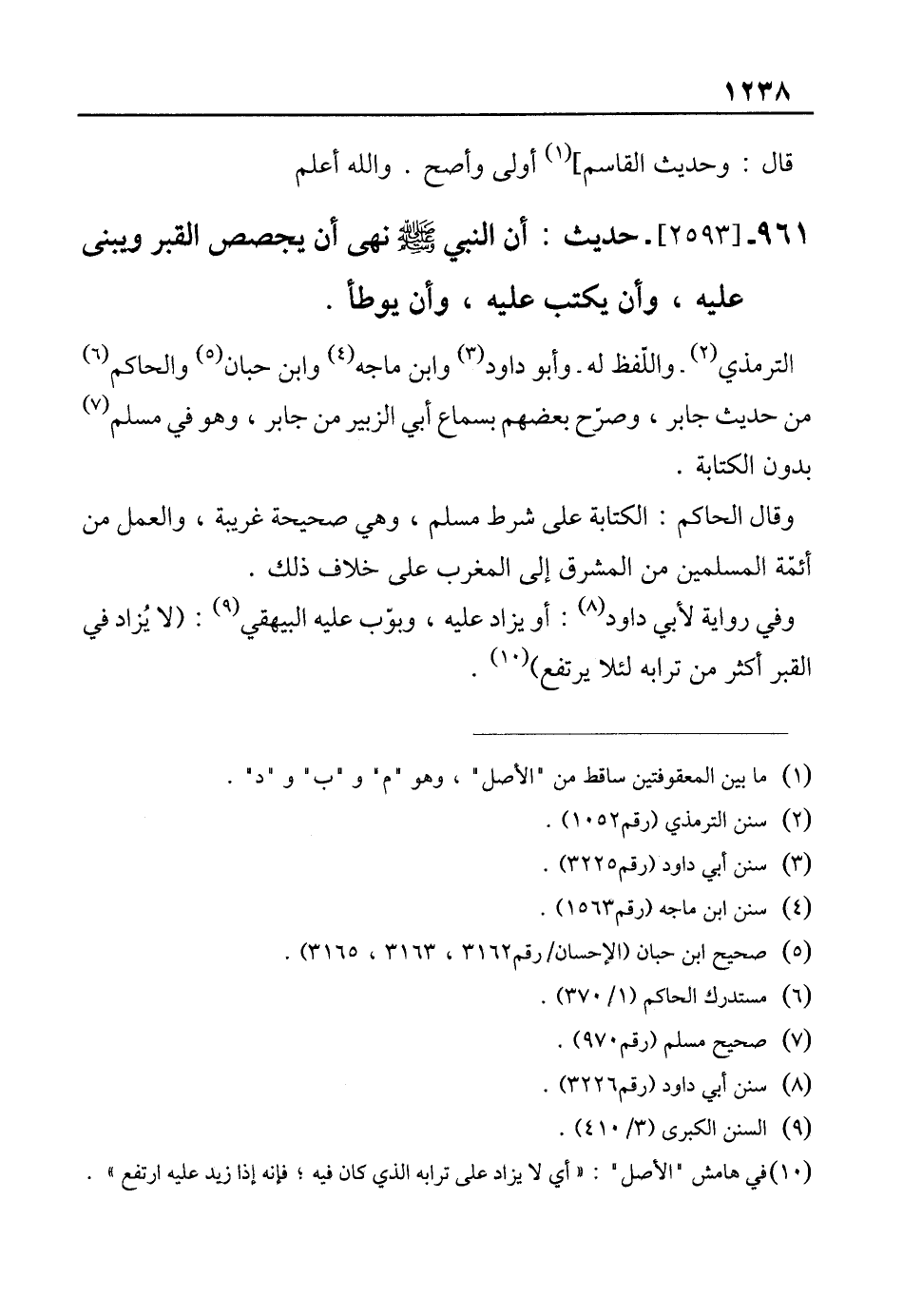 961 - [2593]- حديث: أن النبي-صلى الله عليه وسلم- نهى أن يجصص القبر ويبنى عليه، وأن يكتب عليه، وأن يوطأ.