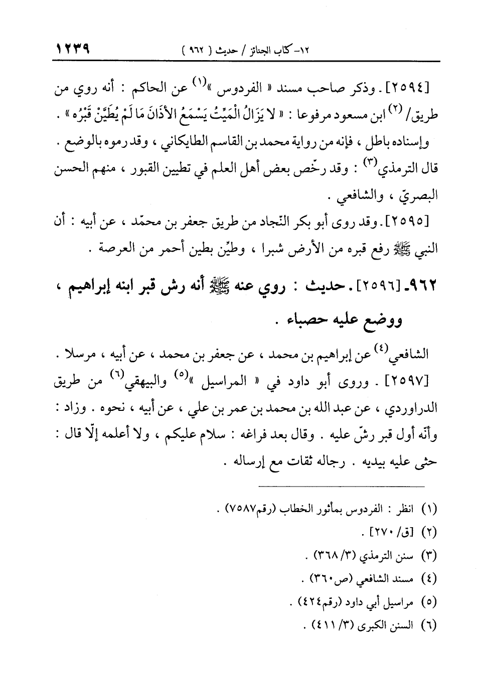 962 - [2596]- حديث: روي عنه في - صلى الله عليه وسلم - أنه رش قبر ابنه إبراهيم، ووضع عليه حصباء.
