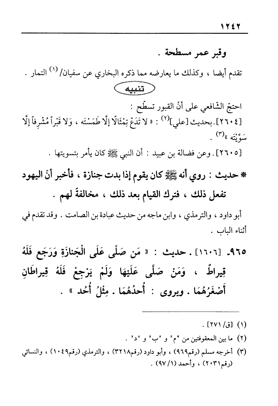[2604]- بحديث [علي] (¬2): "لا تَدَعْ تِمْثَالًا إلَّا طَمَسْتَه، وَلا قَبْرًا مُشْرِفًا إلَّا سَوَّيْتَه" (¬3).