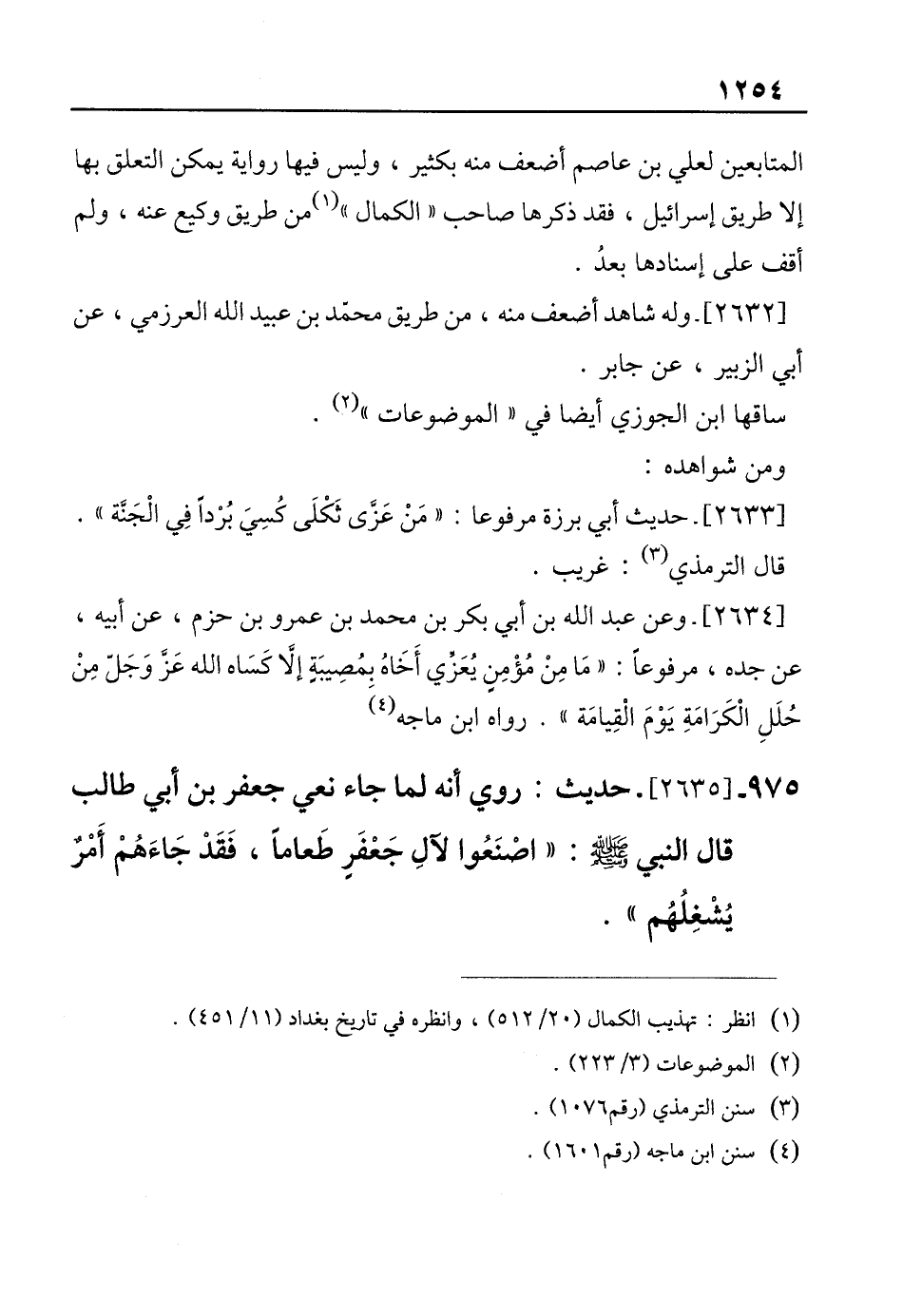 975 - [2635]-حدثنا: روي أنه لما جاء نعي جعفر بن أبي طالب قال النبي-صلى الله عليه وسلم- "اصنَعُوا لآلِ جَعْفَرٍ طَعامًا، فَقَذ جَاءَهُمْ أَمْرٌ يُشْغِلُهُم".