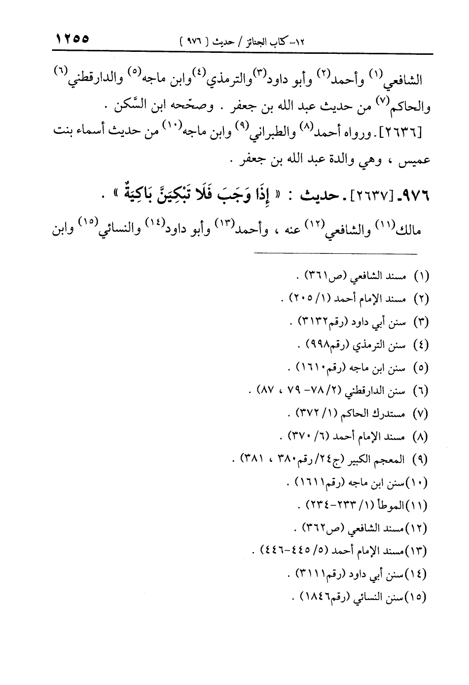 976 - [2637]- حديث: "إِذَا وَجَب فَلَا تَبْكِيَنَّ بَاكيَةٌ". مالك (¬11) والشافعي (¬12) عنه، وأحمد (¬13) وأبو داود (¬14) والنسائي (¬15) وابن