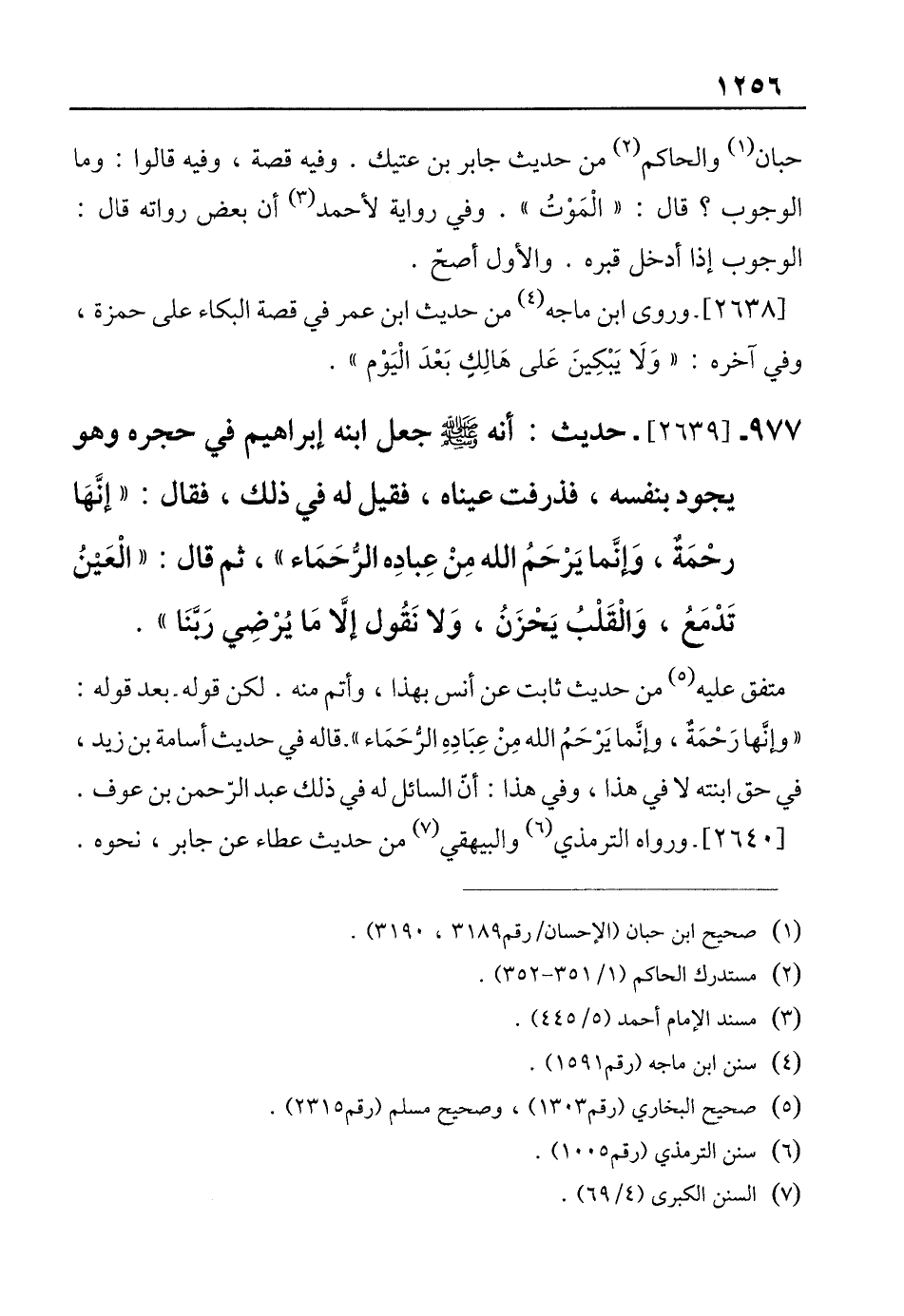 977 - [2639]- حديث: أنه -صلى الله عليه وسلم - جعل ابنه إبراهيم لمحي حجره وهو يجود بنفسه، فذرفت عيناه، فقيل له في ذلك، فقال: "إنَّهَا رحْمَةٌ، وَإنَّما يَرْحَمُ الله مِنْ عِبادِه الرُّحَمَاء"، ثم قال: "الْعَين تَذمَعُ، وَالْقَلْبُ يَحزَنُ، وَلا نَقُول إلَّا مَا يرْضِي رَبنَا".