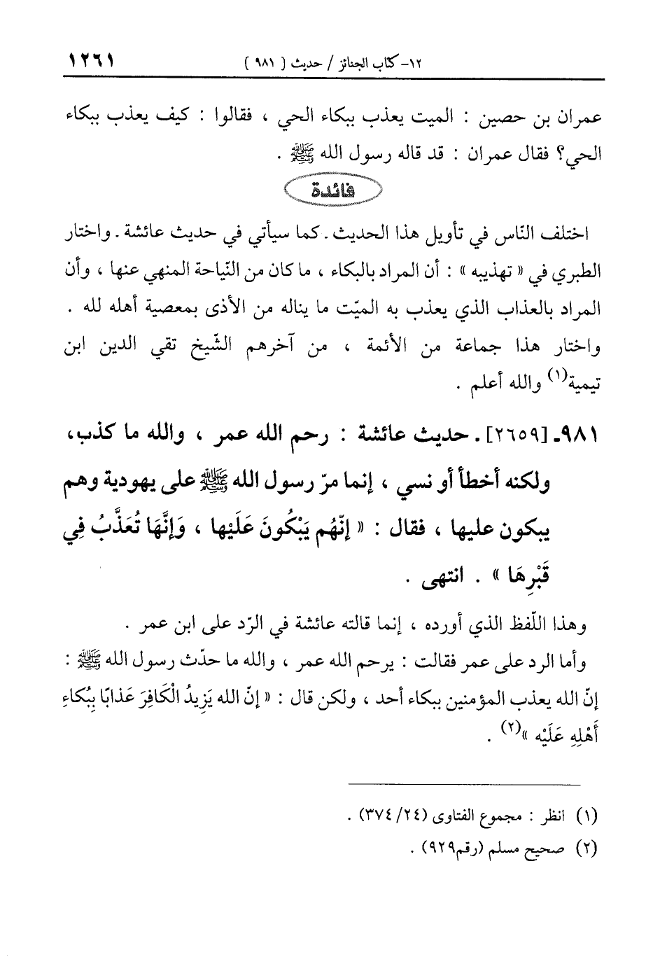 981 - [2659]- حديث عائشة: رحم الله عمر، والله ما كذب، ولكنه أخطأ أو نسي، إنما مرّ رسول الله-صلى الله عليه وسلم- على يهودية وهم يبكون عليها، فقال: "إنّهُم يَبْكُونَ عَلَيها، وَإنَّهَا تُعَذَّبُ في قَبْرِهَا". انتهى.