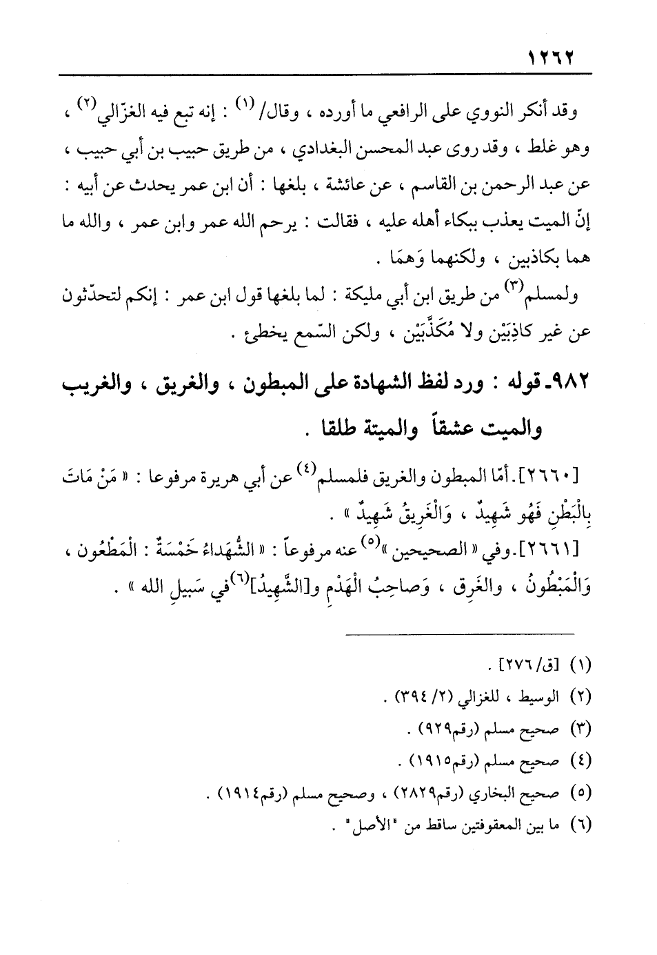 [2660]- أمّا المبطون والغريق فلمسلم (¬4) عن أبي هريرة -رضي الله عنه- مرفوعًا: "مَنْ مَاتَ بِالْبَطْنِ فَهُو شَهِيد، وَالْغَرِيقُ شَهِيدٌ".